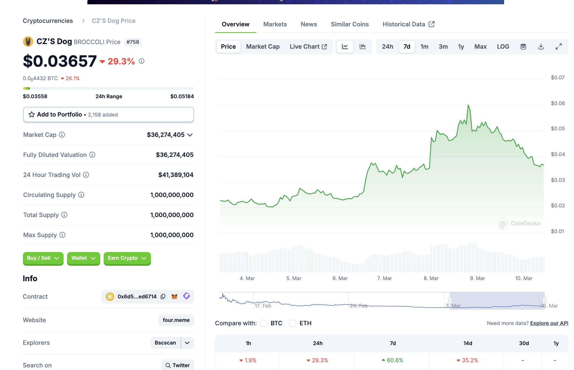 Mit einer Marktkapitalisierung von rund 36 Millionen USD befindet sich CZ’S Dog (BROCCOLI) auf Platz 758 im Coingecko Ranking. Damit ist der Coin noch sehr klein.