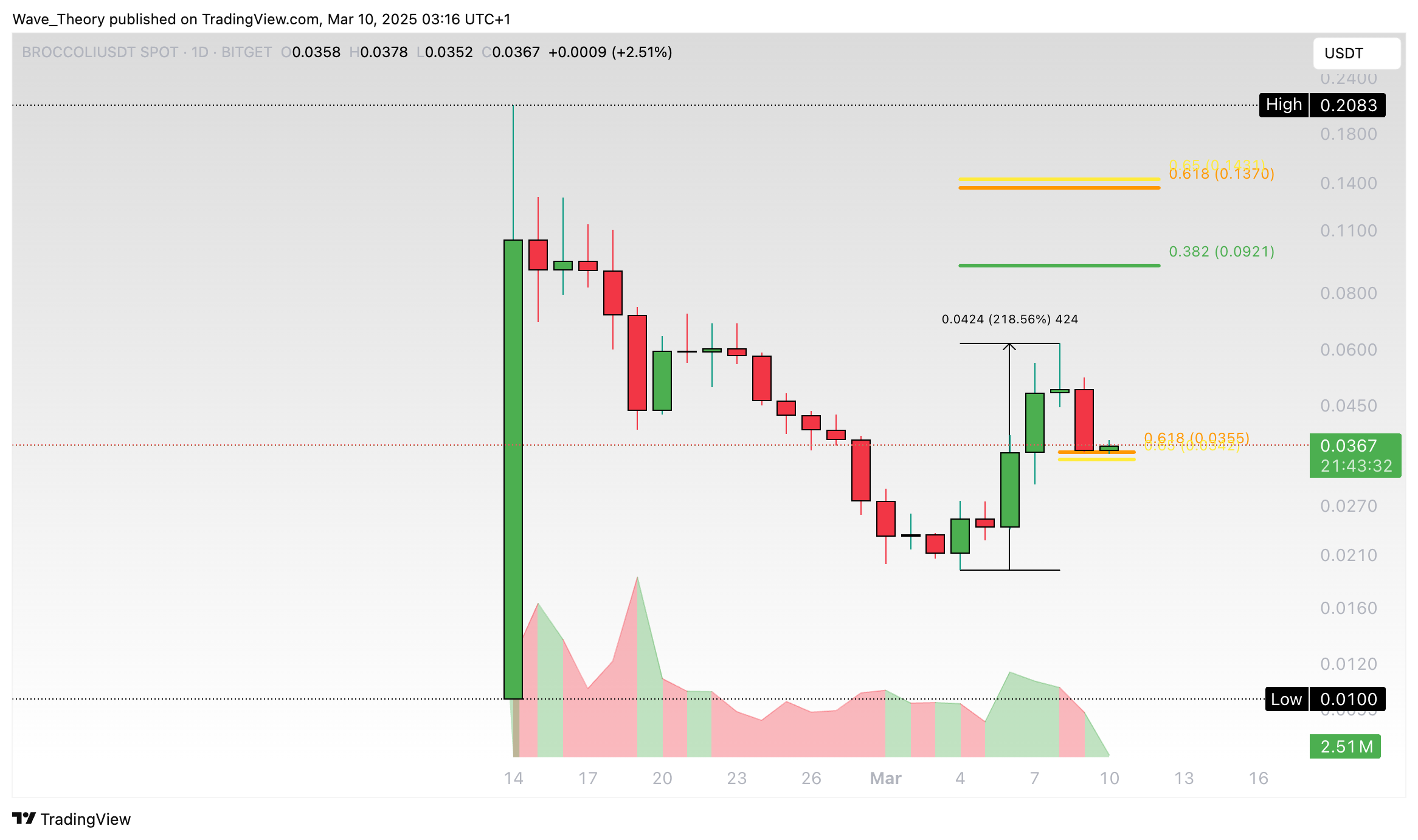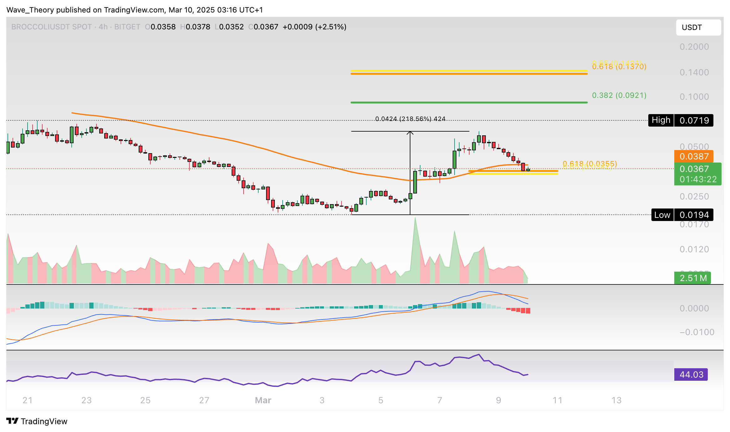 Nichtsdestoweniger stößt CZ’S Dog (BROCCOLI) jetzt auf signifikante Golden Ratio Unterstützung bei rund 0,035 USD. Dort könnte der Kurs jetzt bullisch abprallen, um die nächsten Fib Widerstände anzuvisieren.