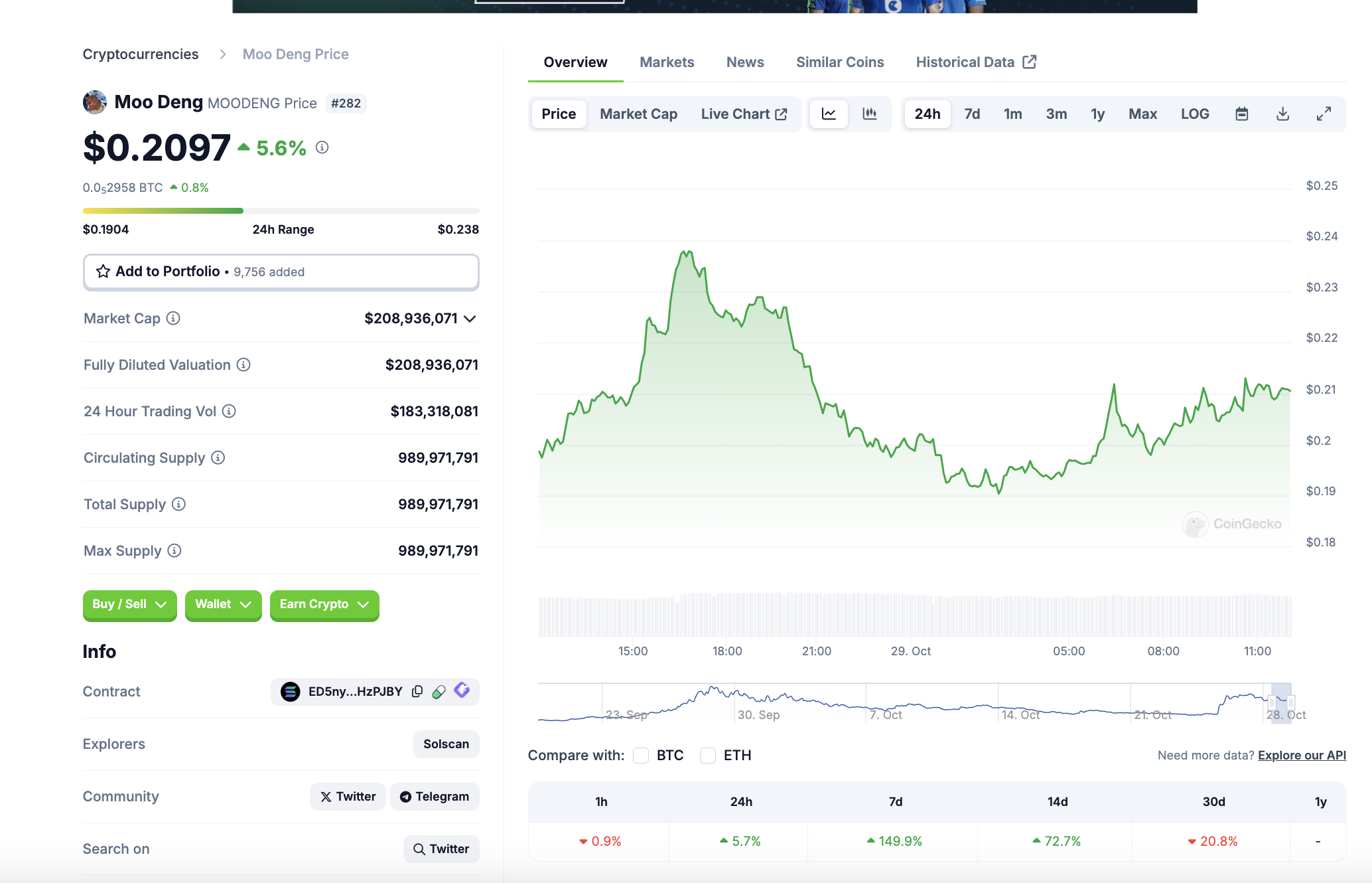 Mit einer Marktkapitalisierung von rund 209 Millionen USD befindet sich Moo Deng (MOODENG) auf Platz 282 im Coingecko Ranking. Damit ist der Moo Deng Coin noch recht klein und unbekannt.