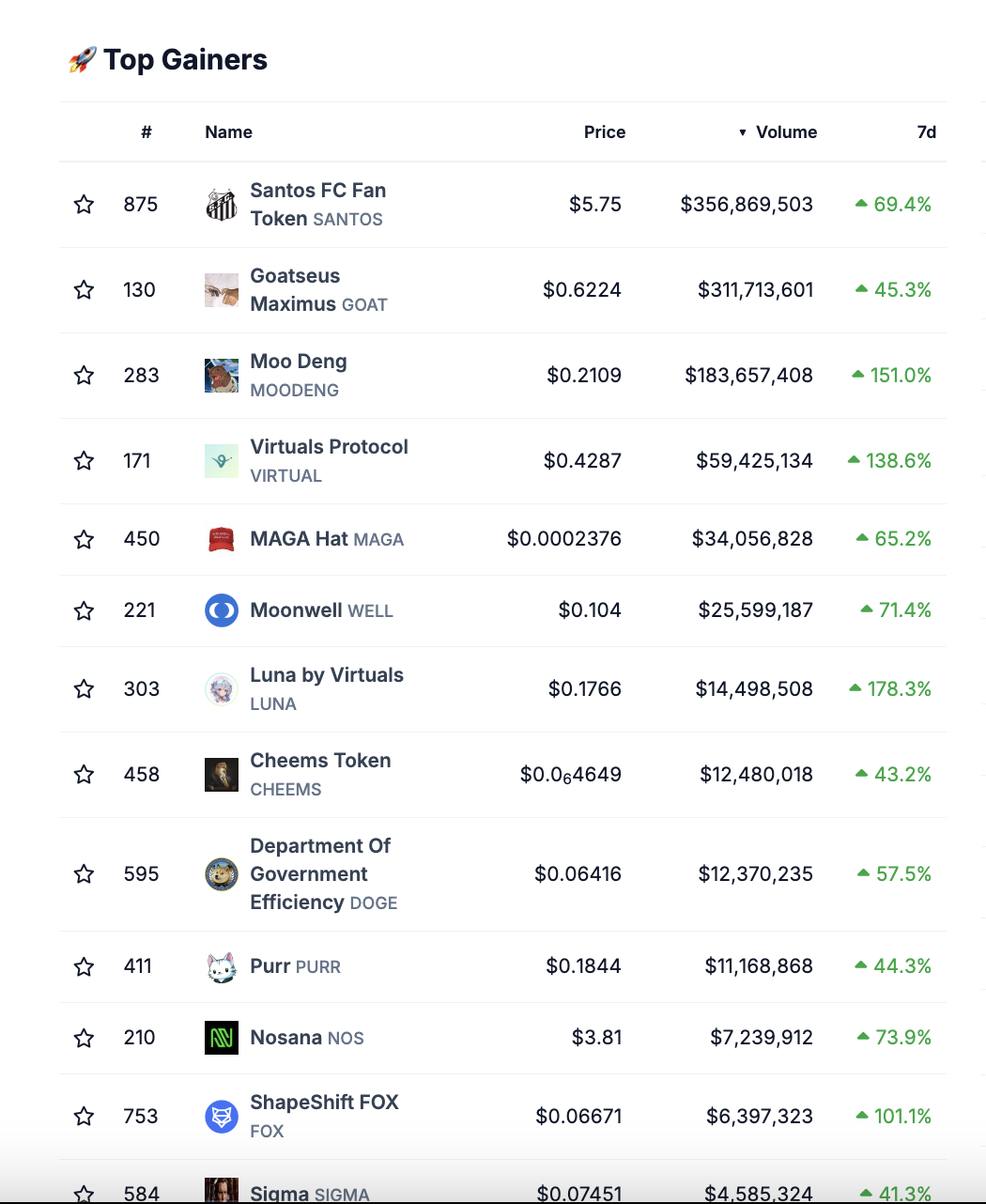 In den letzten sieben Tagen belegt Moo Deng (MOODENG) den dritten Platz der Coins mit dem höchsten Handelsvolumen. Davon ist er mit Abstand am stärksten gestiegen, denn laut Coingecko hat er einen Kurszuwachs von rund 151 % verzeichnet.