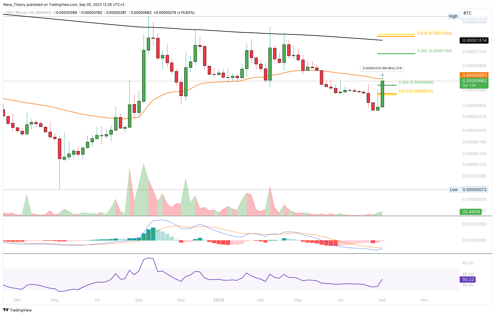 Gegen BTC konnte der OAX Kurs ebenfalls rund 100 % steigen. Jedoch kämpft der Coin jetzt mit dem 50-Wochen-EMA Widerstand bei rund 0,00000691 BTC. Sollte OAX daran bärisch abgewiesen werden, warten bei rund 0,000006 BTC und bei rund 0,000005 BTC die nächsten signifikanten Fib Unterstützungen.