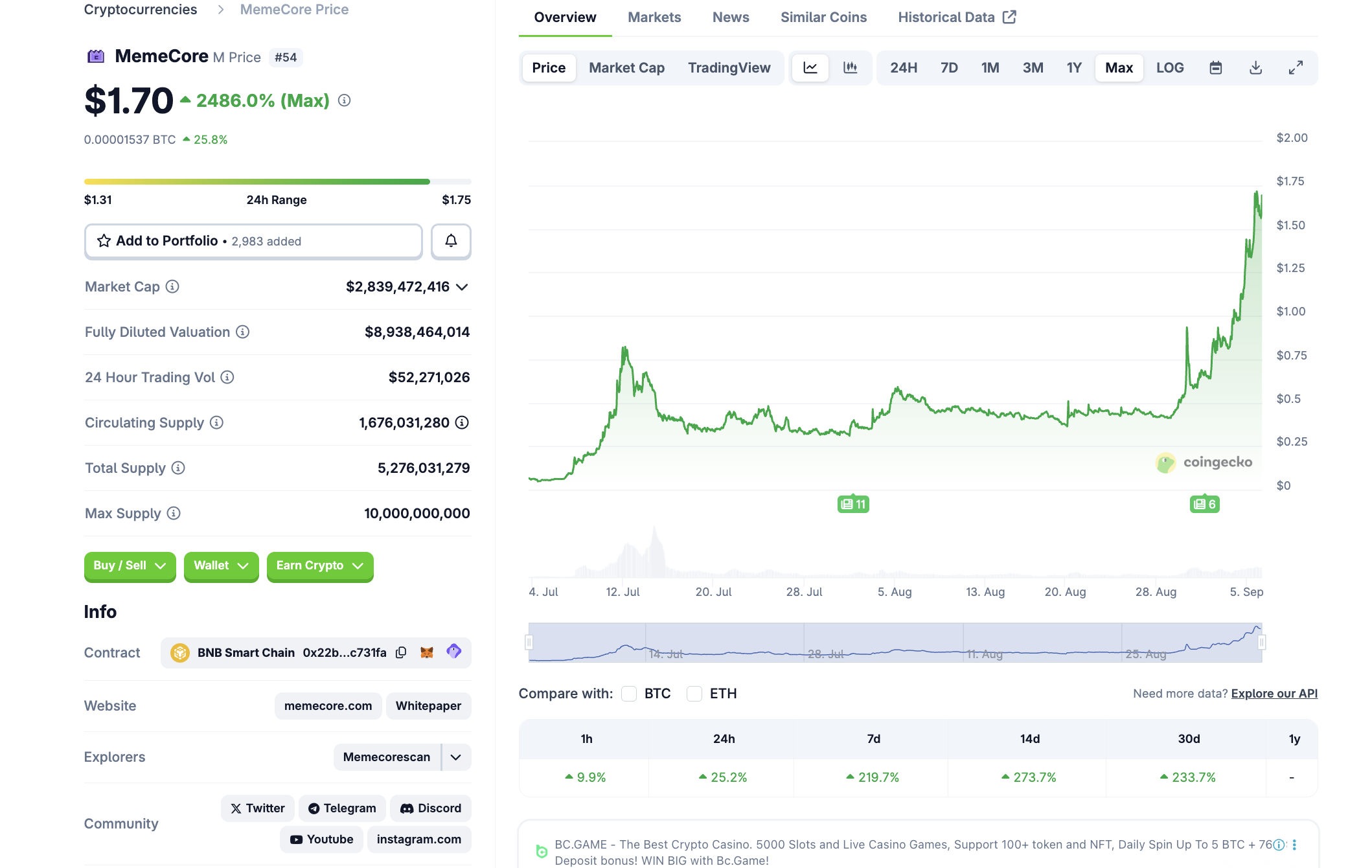 Mit einer Marktkapitalisierung von rund 2,84 Milliarden USD befindet sich MemeCore (M) auf Platz 54 im Coingecko Ranking. Damit ist der Coin bereits sehr groß.