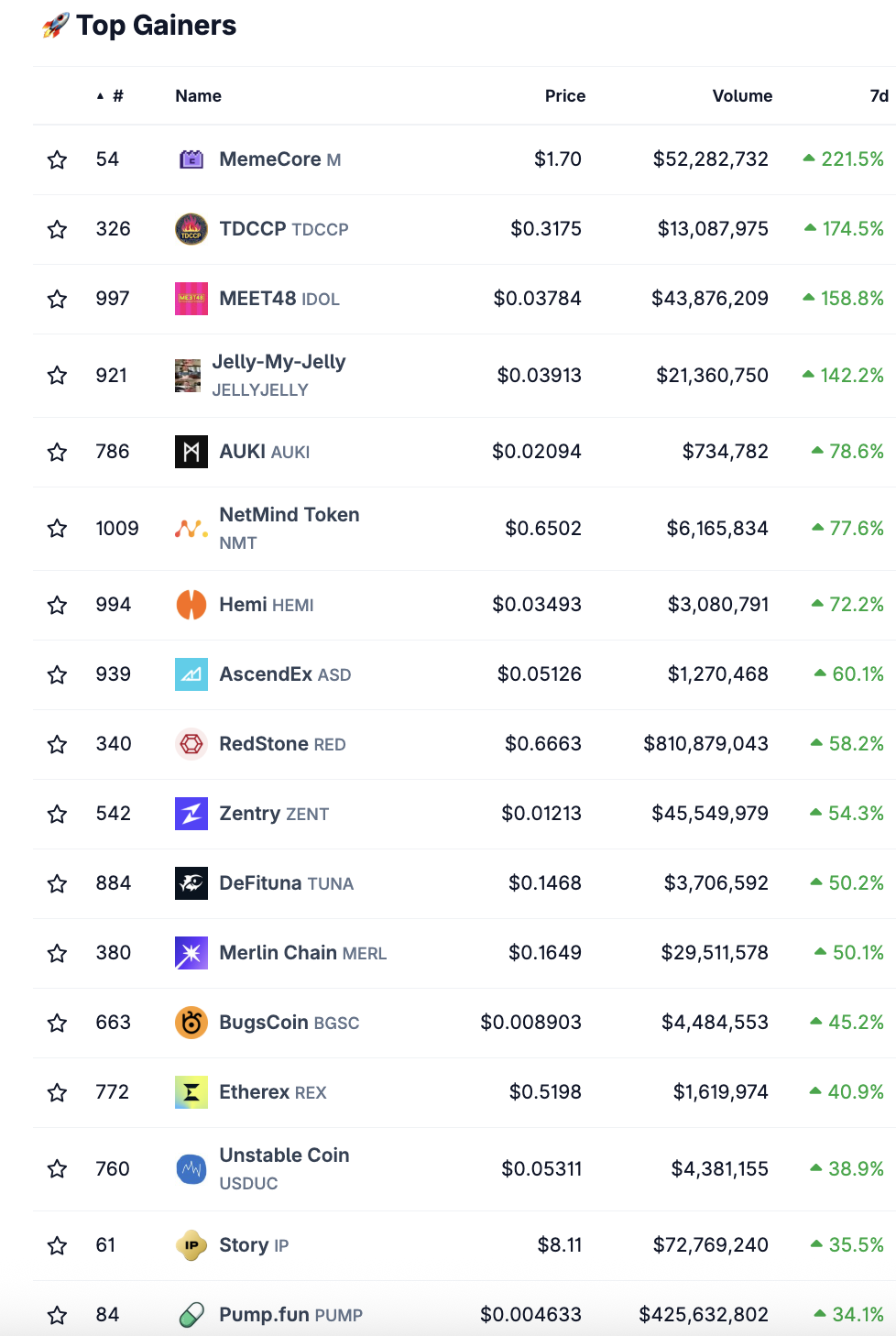 Der Coin MemeCore (M) belegt in dieser Woche den ersten Platz der Top-Gewinner auf dem Krypto-Markt. Laut Coingecko ist er dabei rund 221,5 % innerhalb der letzten sieben Tage gestiegen.