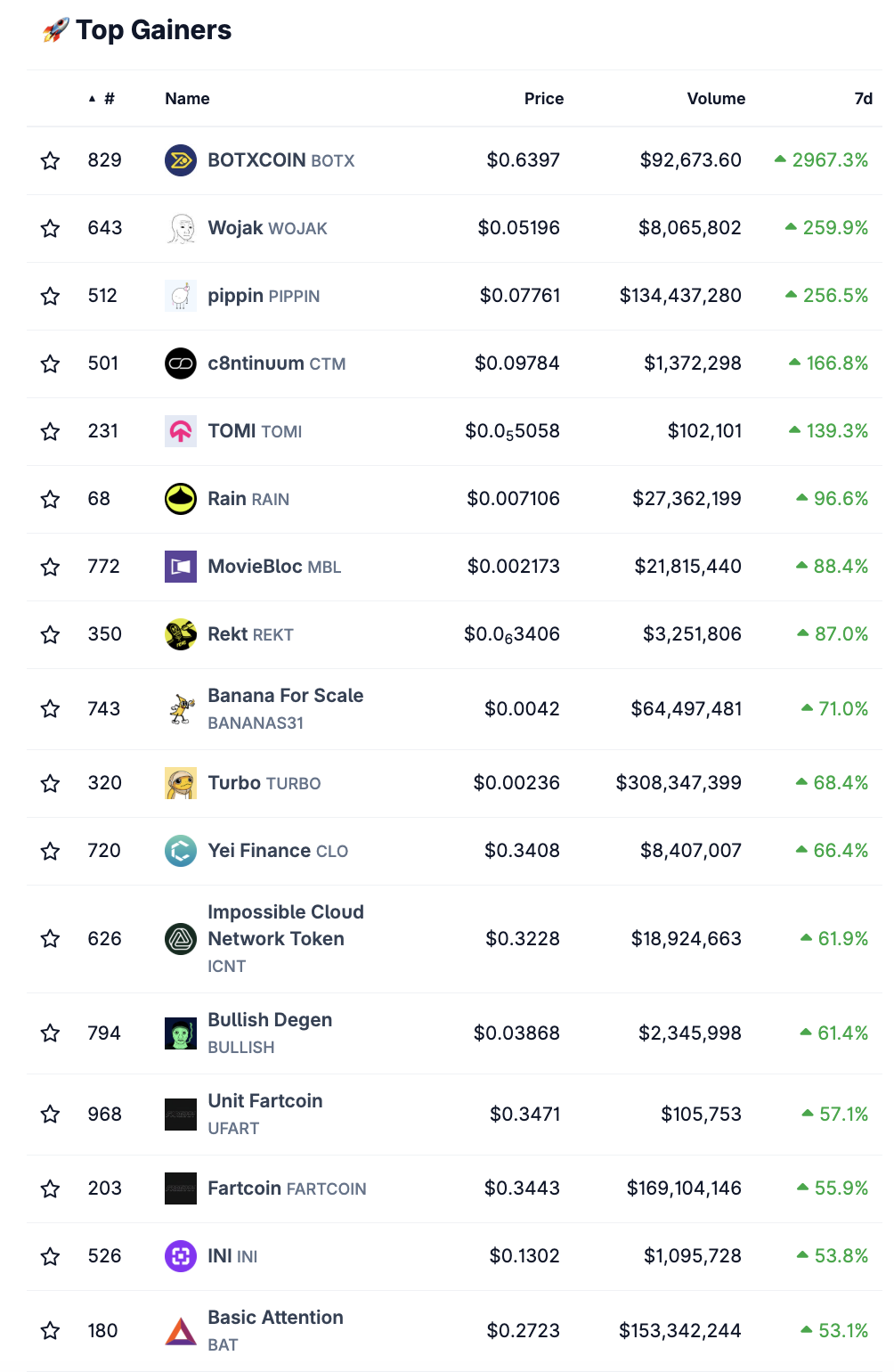 Der Coin Rain (RAIN) belegt in dieser Woche den sechsten Platz der Top-Gewinner auf dem Krypto-Markt. Laut Coingecko ist er innerhalb der letzten sieben Tage rund 97 % im Kurs gestiegen.