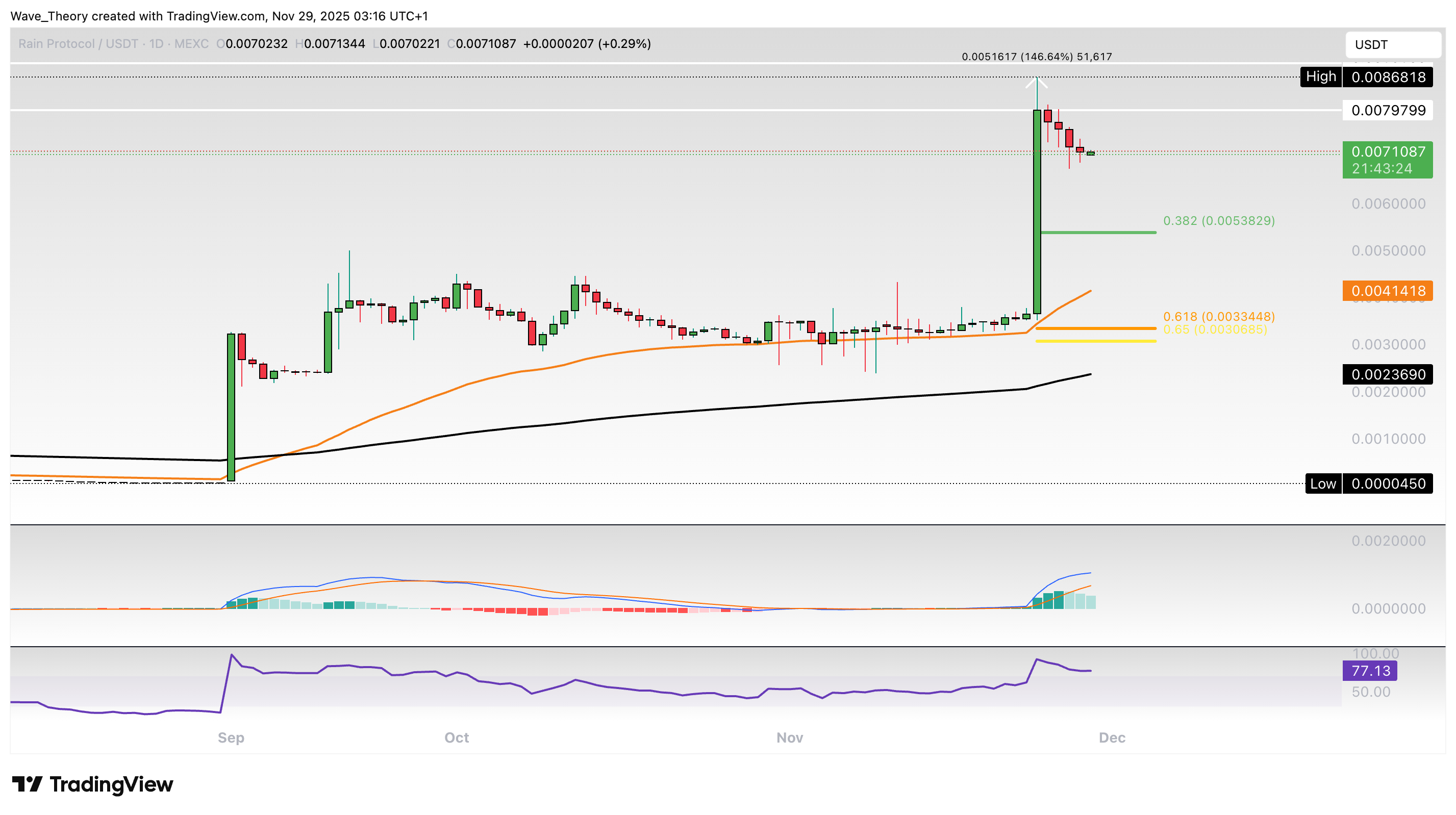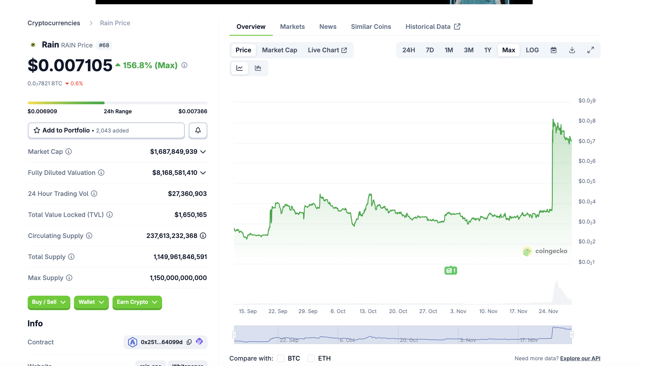 Mit einer Marktkapitalisierung von rund 1,7 Milliarden USD befindet sich Rain (RAIN) auf Platz 68 im Coingecko Ranking. Damit ist der Coin bereits sehr groß.