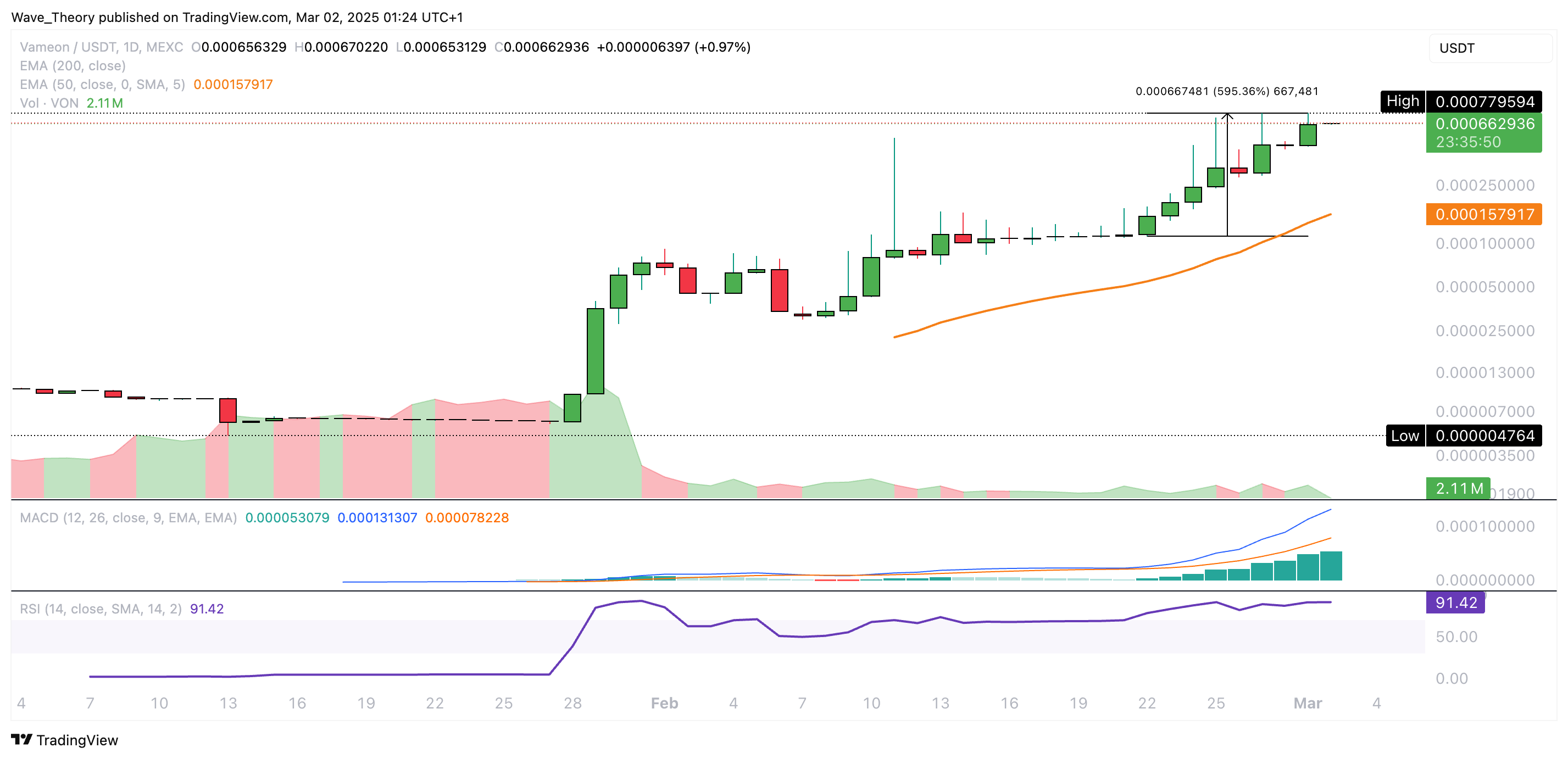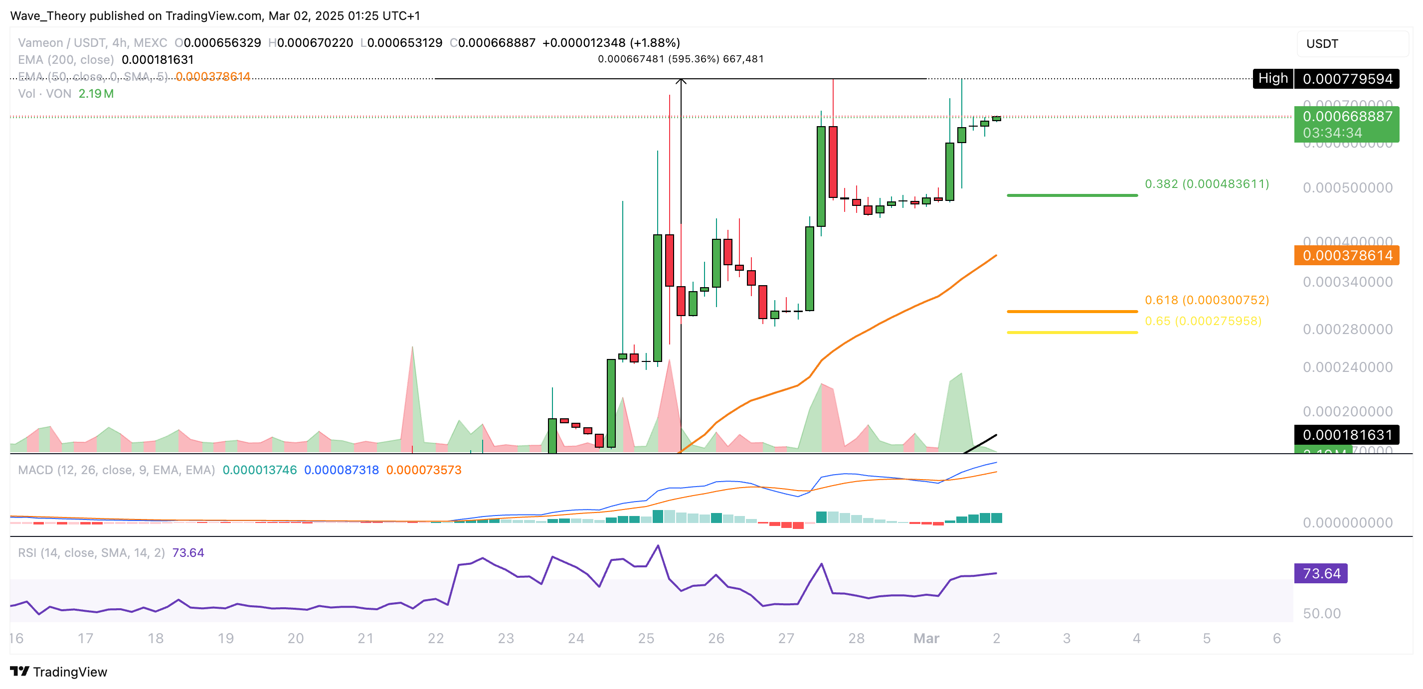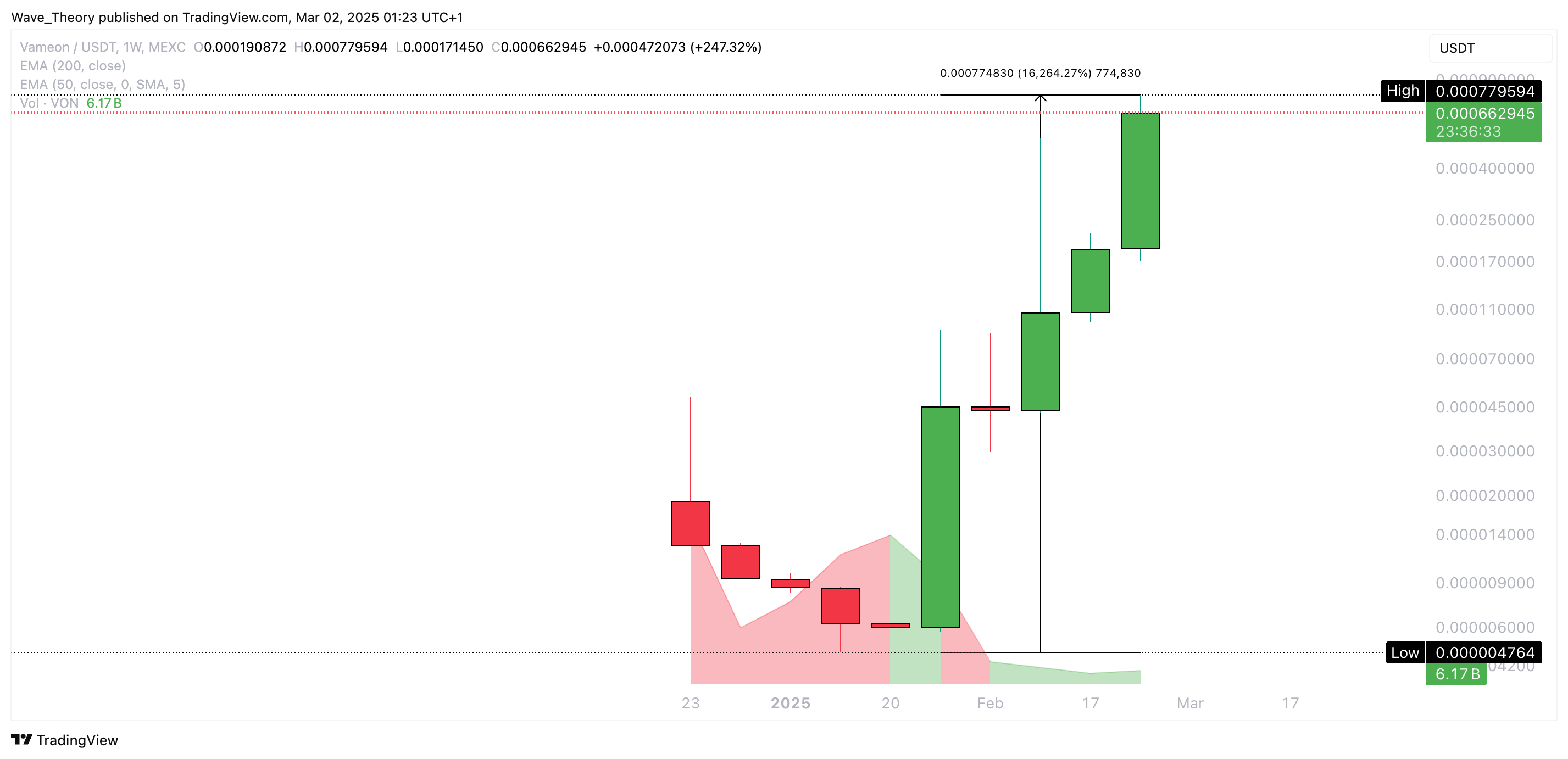 Wer in den Coin VON (VON) zum besten Einstiegspunkt am Samstag 22. Februar 2025 1.000 EUR in den Coin gesteckt hat, saß gestern bereits auf rund 7.000 EUR.