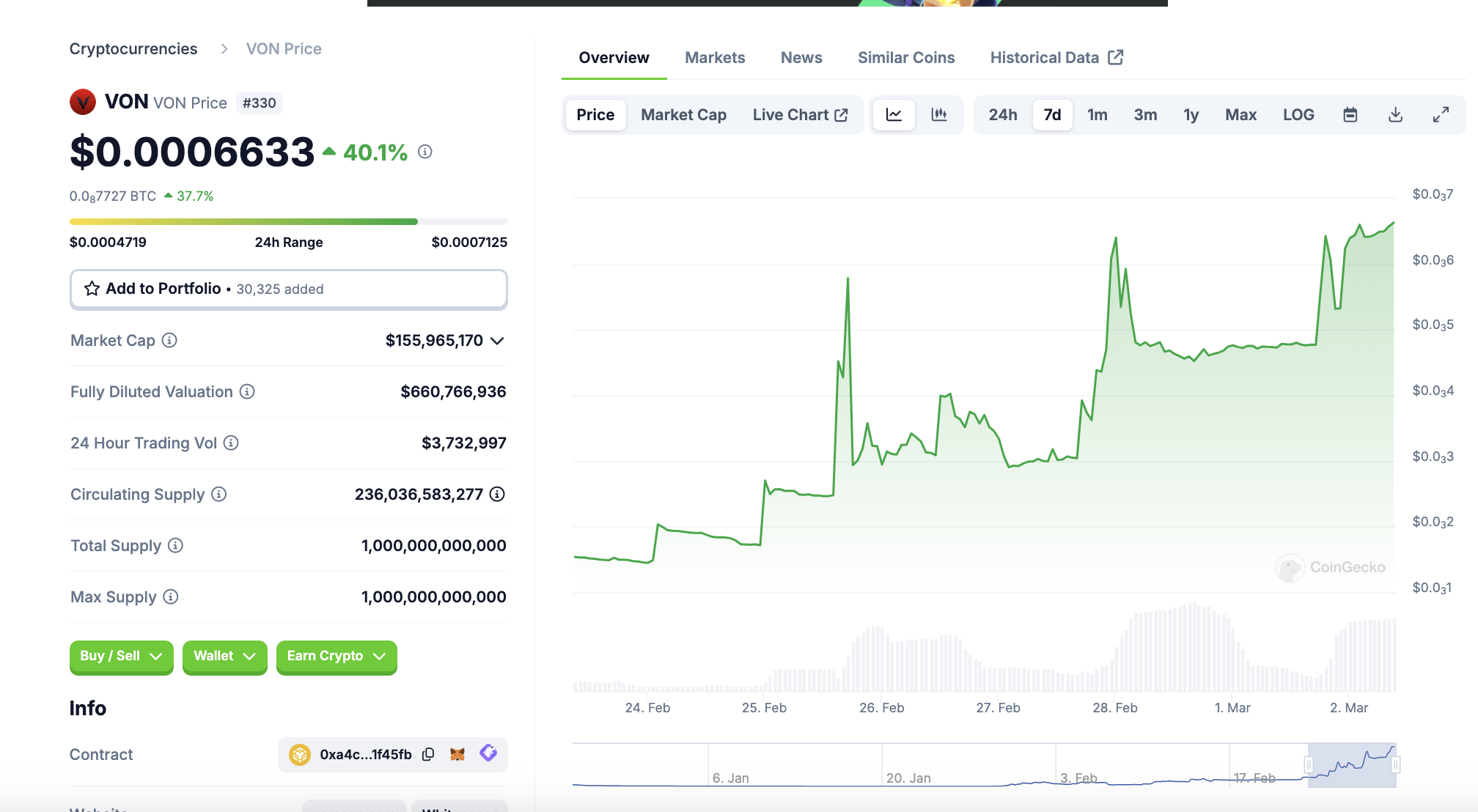 Mit einer Marktkapitalisierung von rund 155 Millionen USD befindet sich VON (VON) auf Platz 330 im Coingecko Ranking. Damit ist der Coin noch sehr klein.