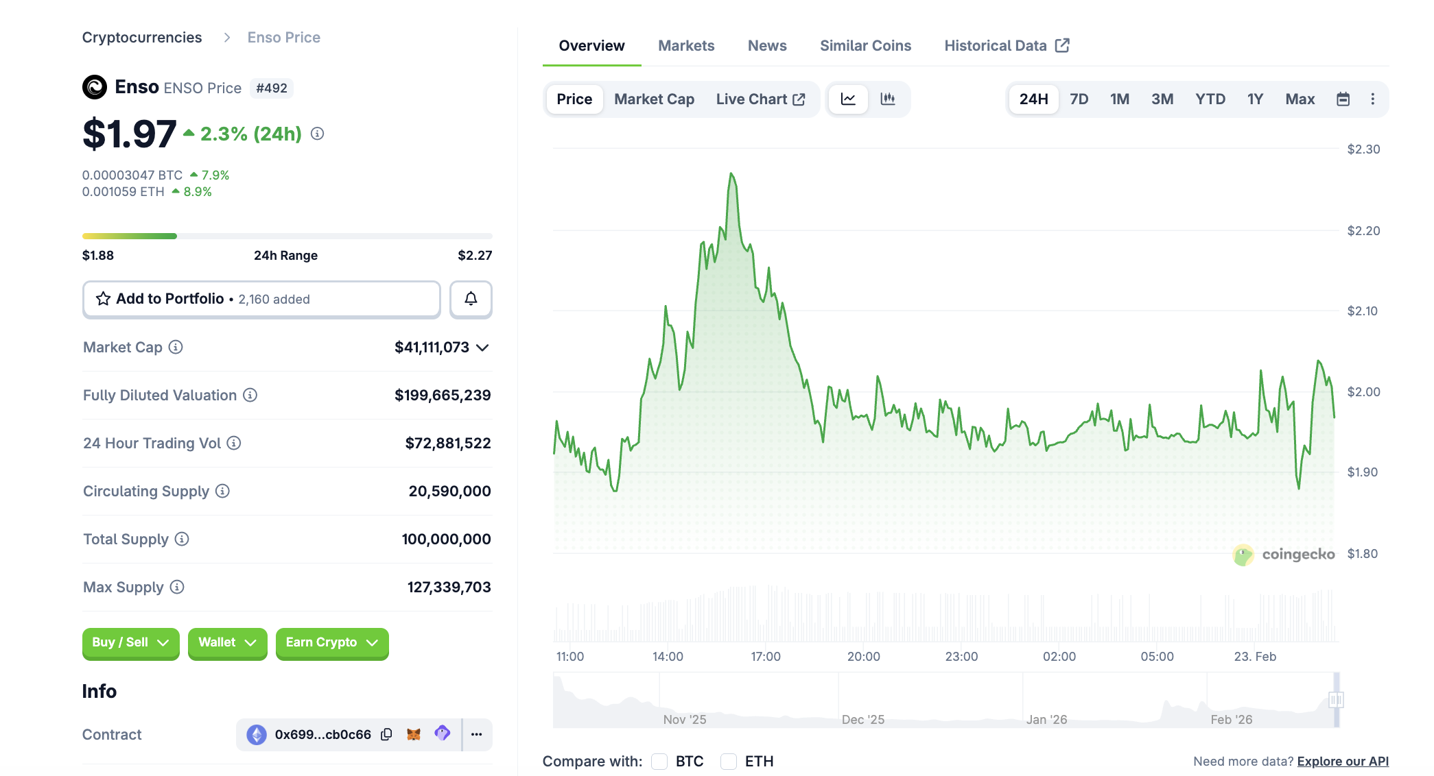 Mit einer Marktkapitalisierung von rund 41 Millionen USD befindet sich Enso (ENSO) auf Platz 492 im Coingecko Ranking. Damit ist der Coin noch sehr klein.