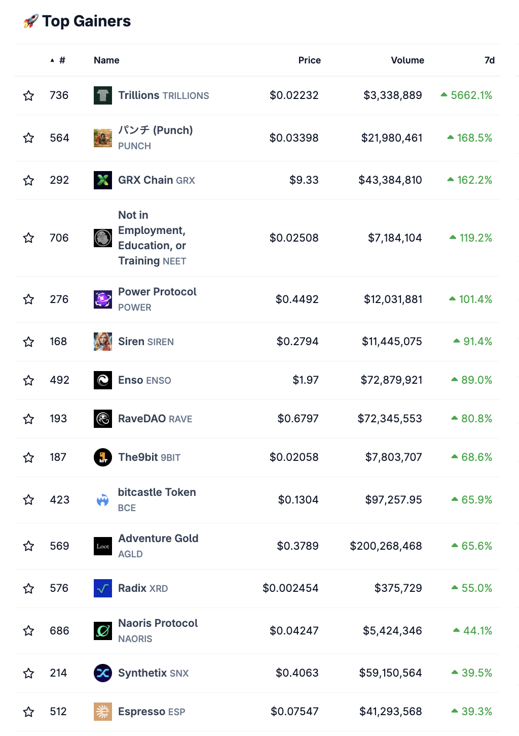 Der Coin Enso (ENSO) belegt in dieser Woche den siebten Platz der Top-Gewinner auf dem Krypto-Markt. Laut Coingecko ist er innerhalb der letzten sieben Tage rund 89 % im Kurs gestiegen. Dabei weist er ein starkes Handelsvolumen von rund 73 Millionen USD auf.