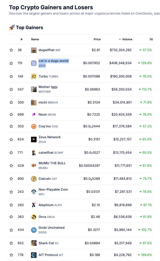 Unter den Top Kursgewinnen auf dem Krypto-Markt belegt cat in dogs world (MEW) mit einem Anstieg von rund 128,8 % in den letzten sieben Tagen und einem Handelsvolumen von fast 406 Millionen USD den ersten Platz.