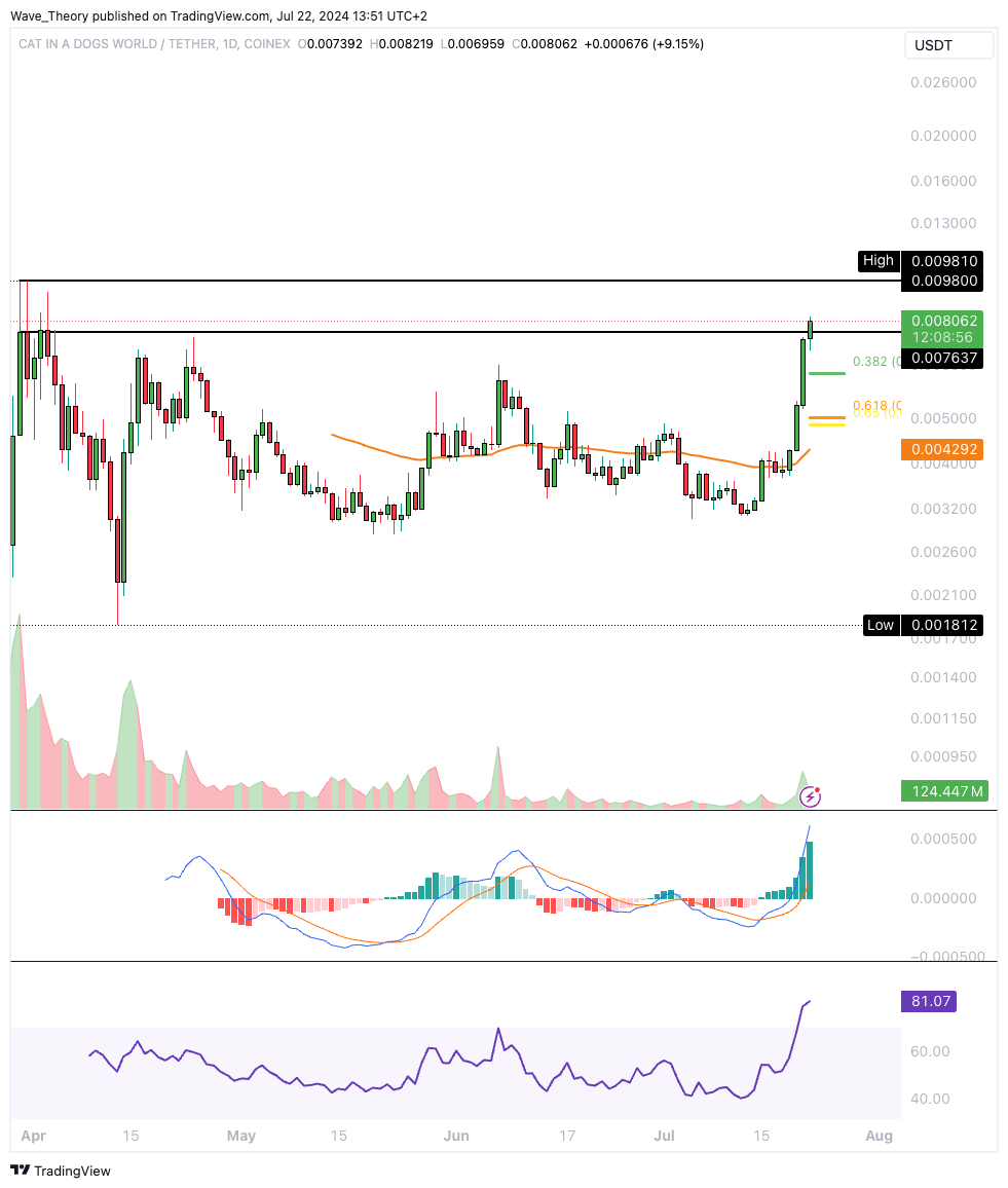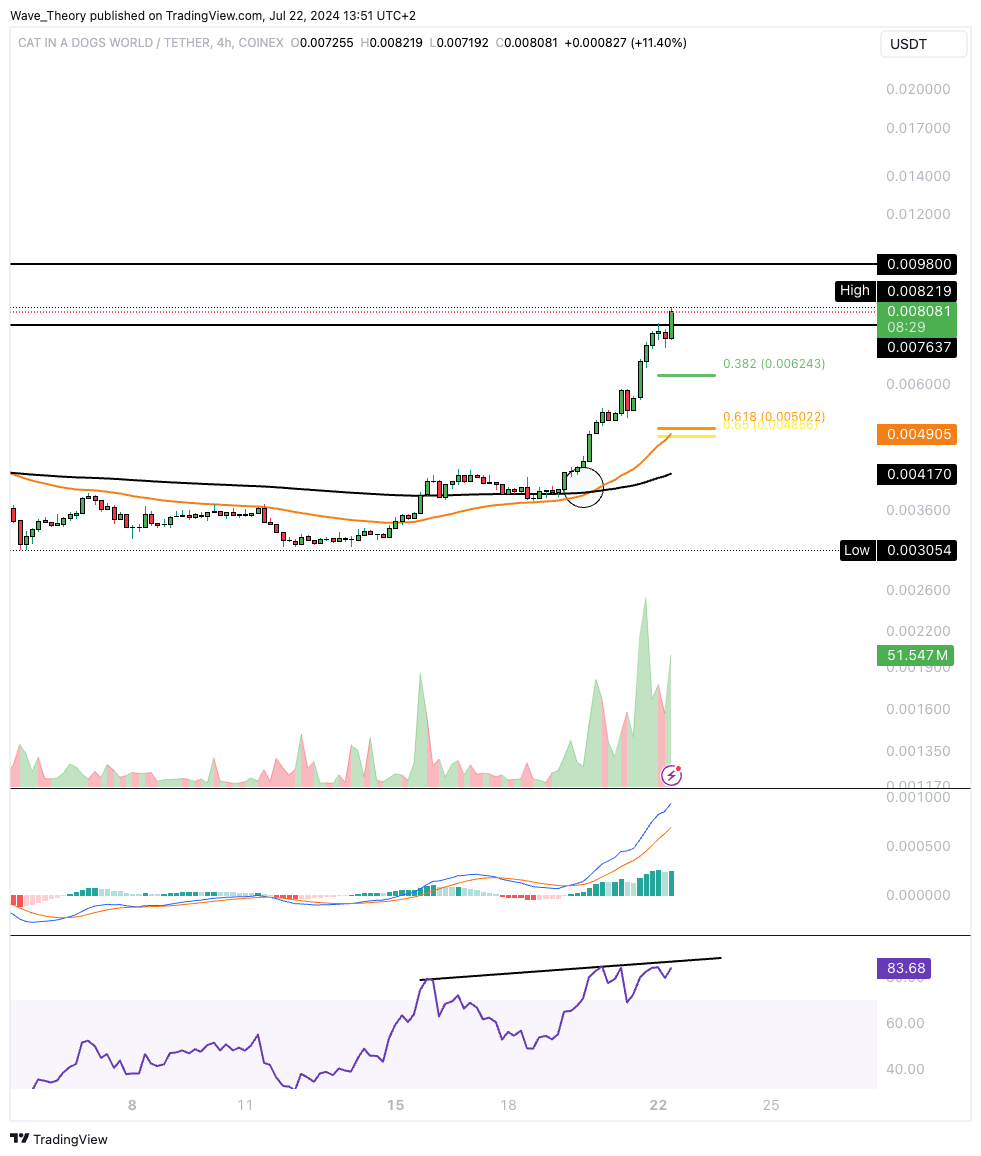 Jetzt stößt cat in a dogs world (MEW) jedoch auf signifikanten Widerstandsbereich zwischen rund 0,00764 USD und 0,0098 USD. Sollte der Coin jetzt daran bärisch abgewiesen werden, warten bei rund 0,00624 USD und bei rund 0,005 USD die nächsten signifikanten Fibonacci Unterstützungen.