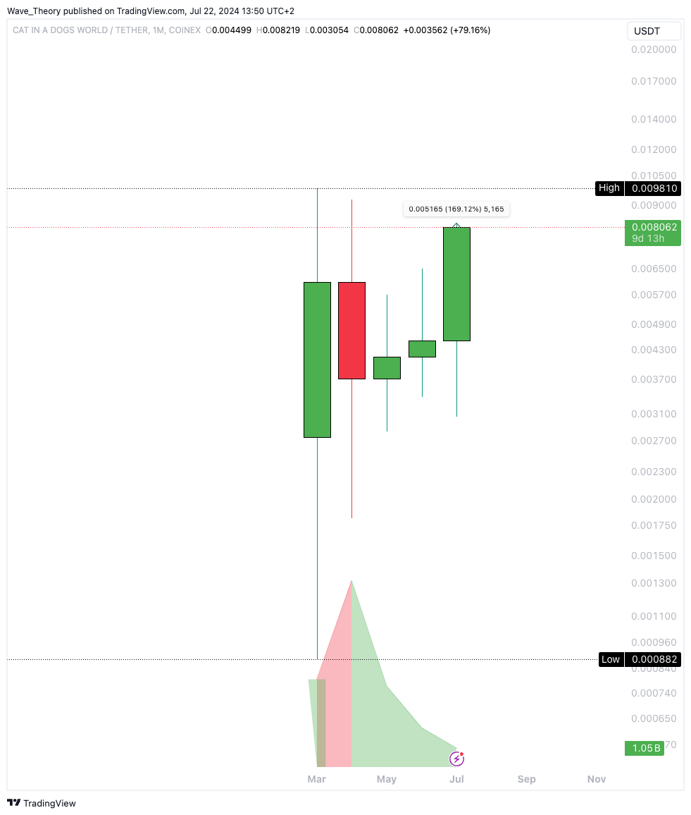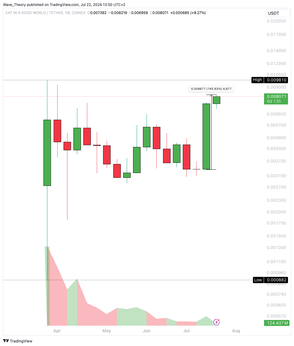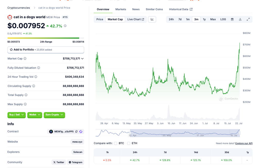 Cat in a dogs world (MEW) ist ein weiterer Memecoin der rasant im Kurs steigt