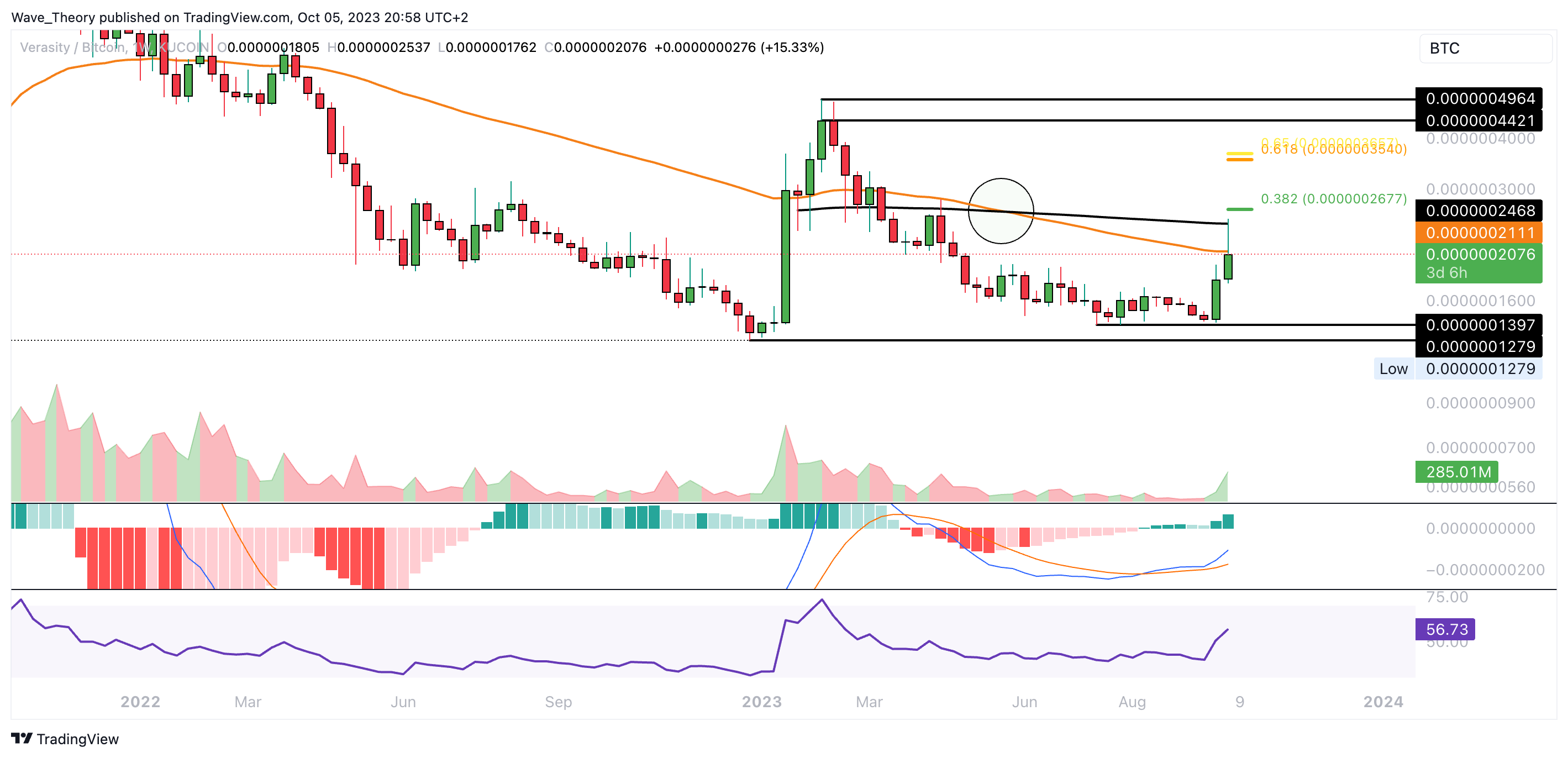 Zudem sind die MACD Linien bullisch überkreuzt, während sich der RSI neutral zeigt. Der Verasity Kurs konnte an der Unterstützung zwischen rund 0,000000128 BTC und 0,00000014 BTC abprallen und stößt jetzt am 200-Wochen-EMA bei rund 0,0000000247 BTC auf signifikanten Widerstand. Zudem liegen bei rund 0,0000002677 BTC und bei rund 0,00000036 BTC die nächsten signifikanten Fib Widerstände.