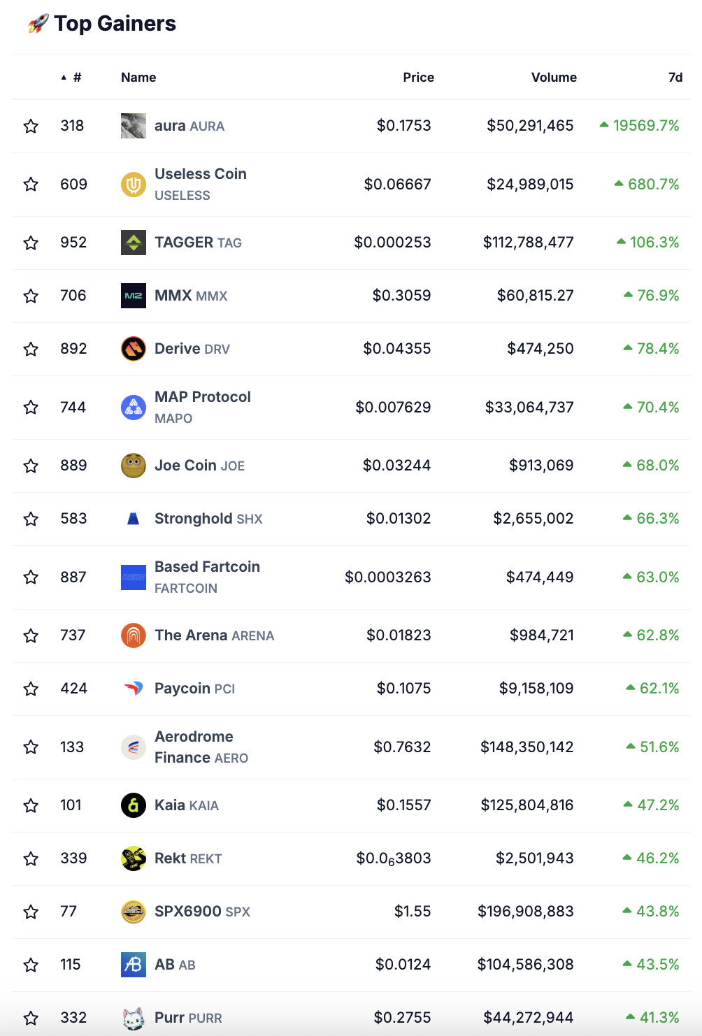 Der Coin aura (AURA) belegt in dieser Woche den ersten Platz der Top-Gewinner auf dem Krypto-Markt. Dabei ist er in den letzten sieben Tagen rund 19.570 % im Kurs gestiegen.