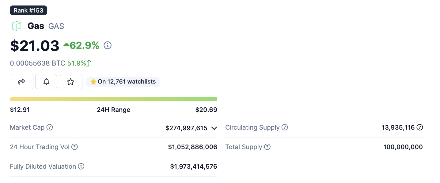 Es handelt sich dabei um den Coin GAS (GAS). Dieser weist derzeit eine Marktkapitalisierung von rund 275 Millionen USD auf. Damit bewegt sich der Token auf Rang 153 im Marktkapitalisierungsranking. Das tägliche Handelsvolumen liegt dabei bei knapp einer Milliarde USD, was relativ zur Marktkapitalisierung extrem hoch ausfällt.