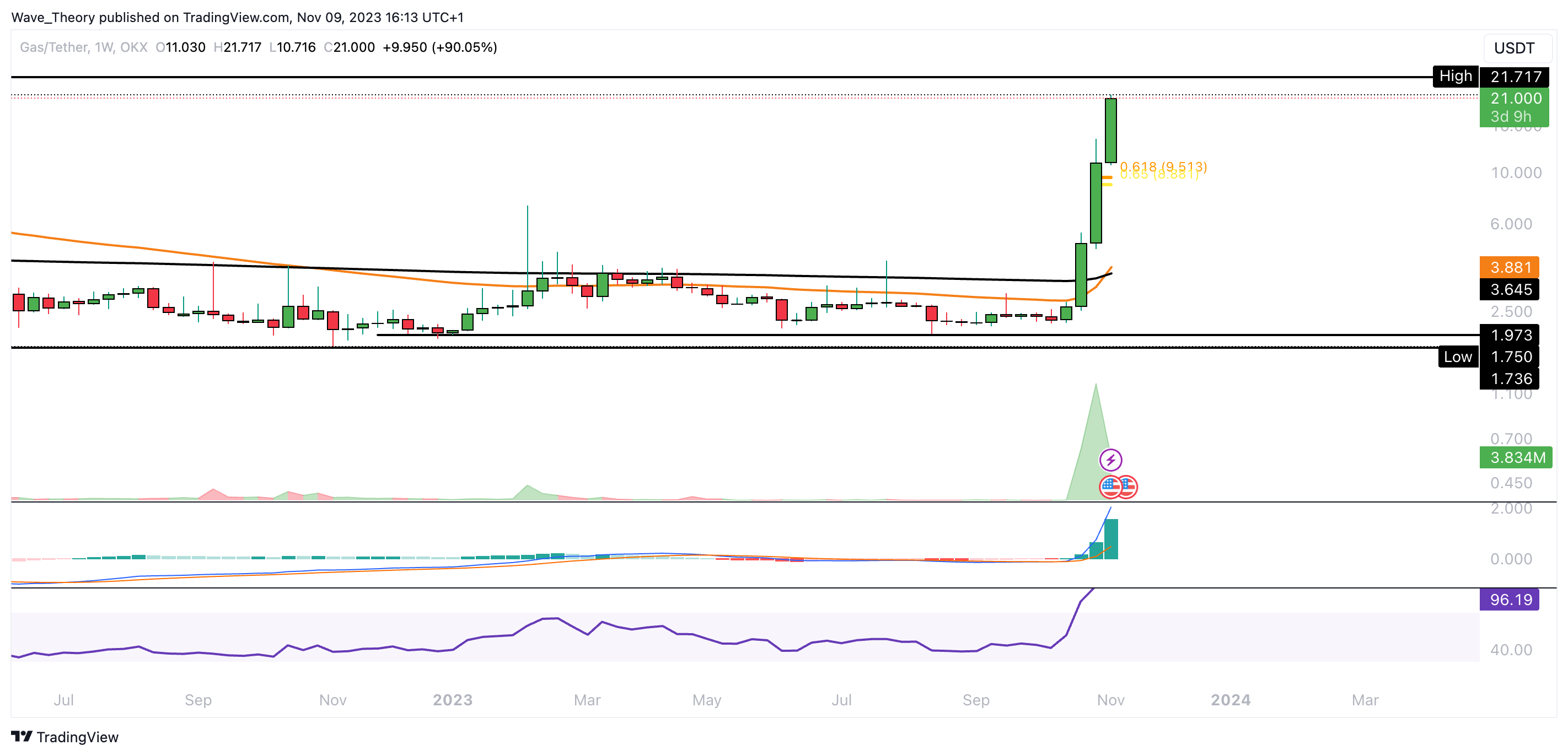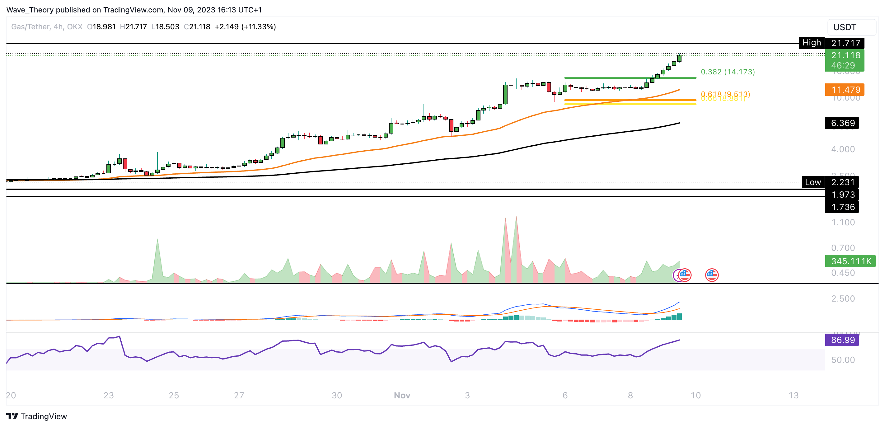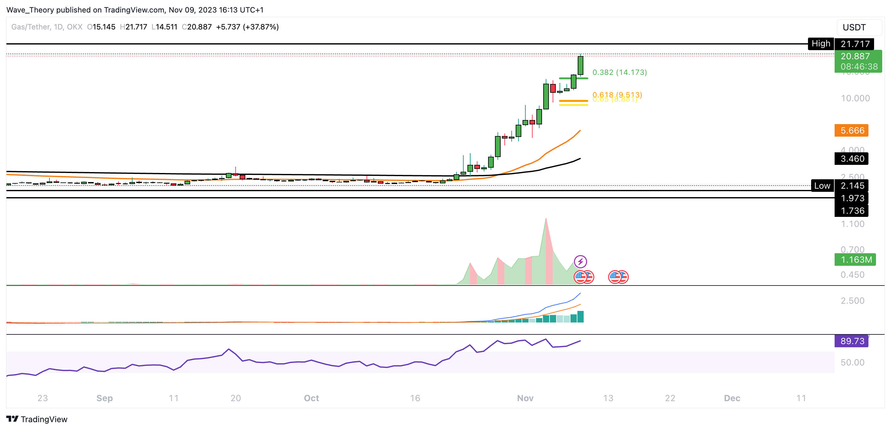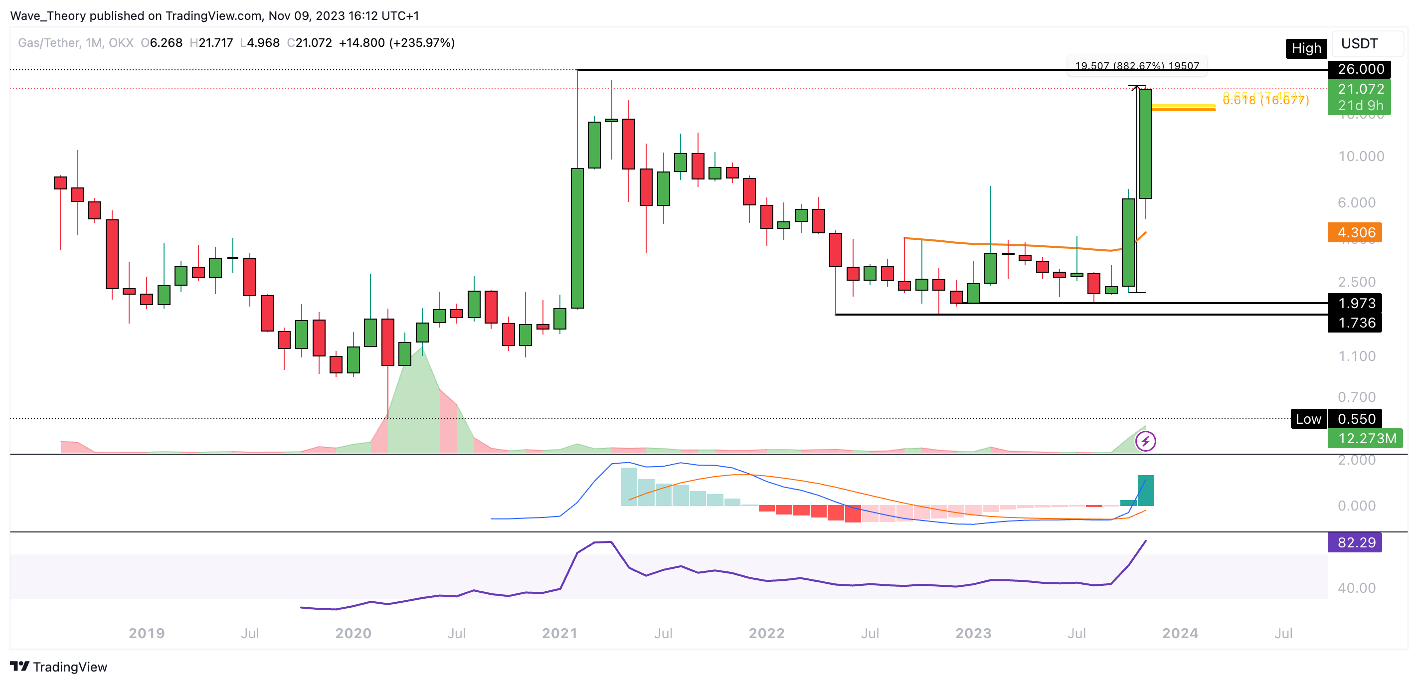 Der Coin konnte seit Oktober fast 900 % steigen. Damit konnte der Kurs auch den Golden Ratio Widerstand bei rund 17 USD brechen. Damit könnte der Kurs jetzt zum letzten Hochpunkt bei rund 26 USD steigen.