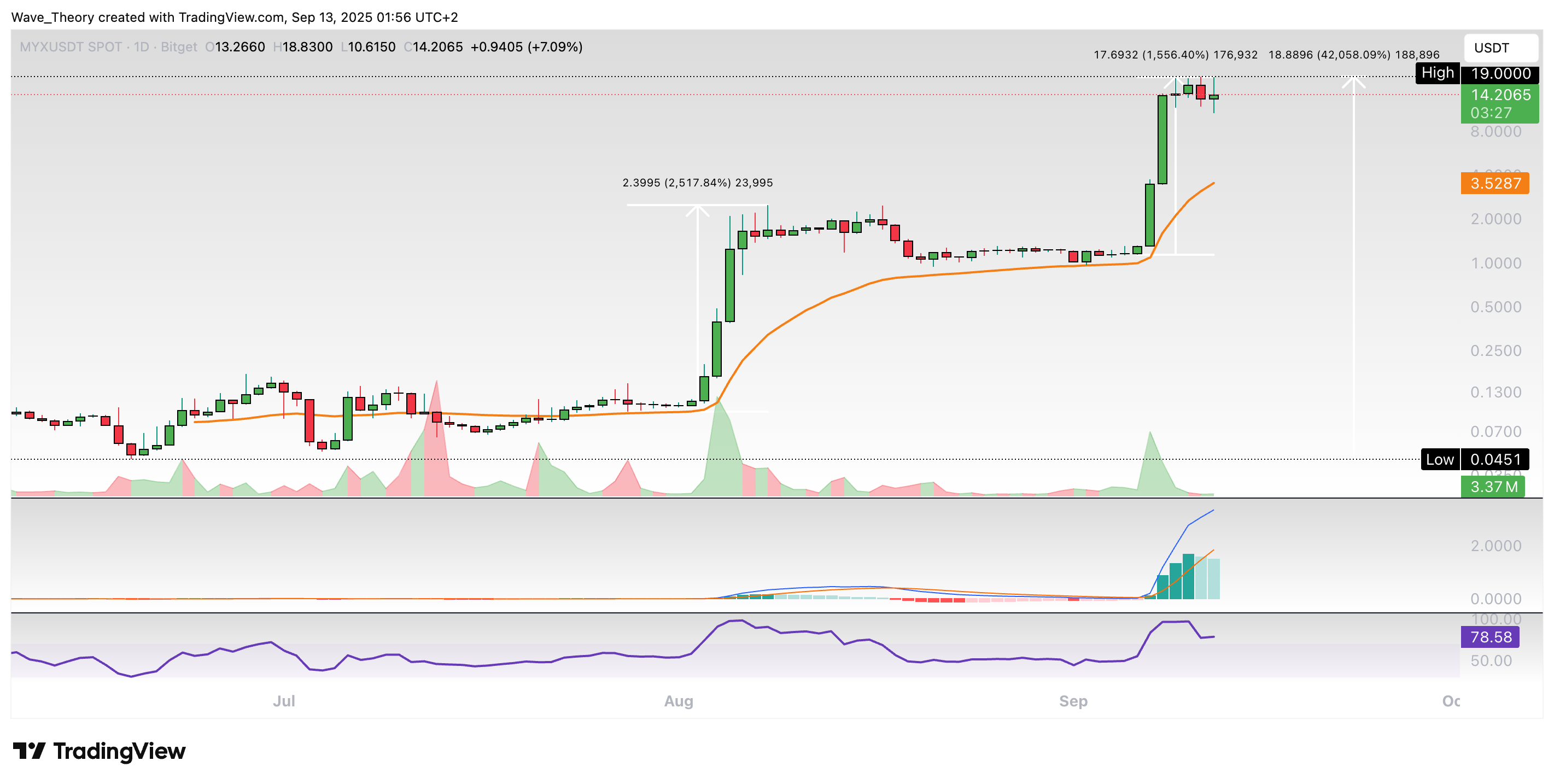 Der Coin MYX Finance hat mehrere Bullenläufe hinter sich. Zunächst ist er im August rund 2.518 % im Kurs gestiegen.