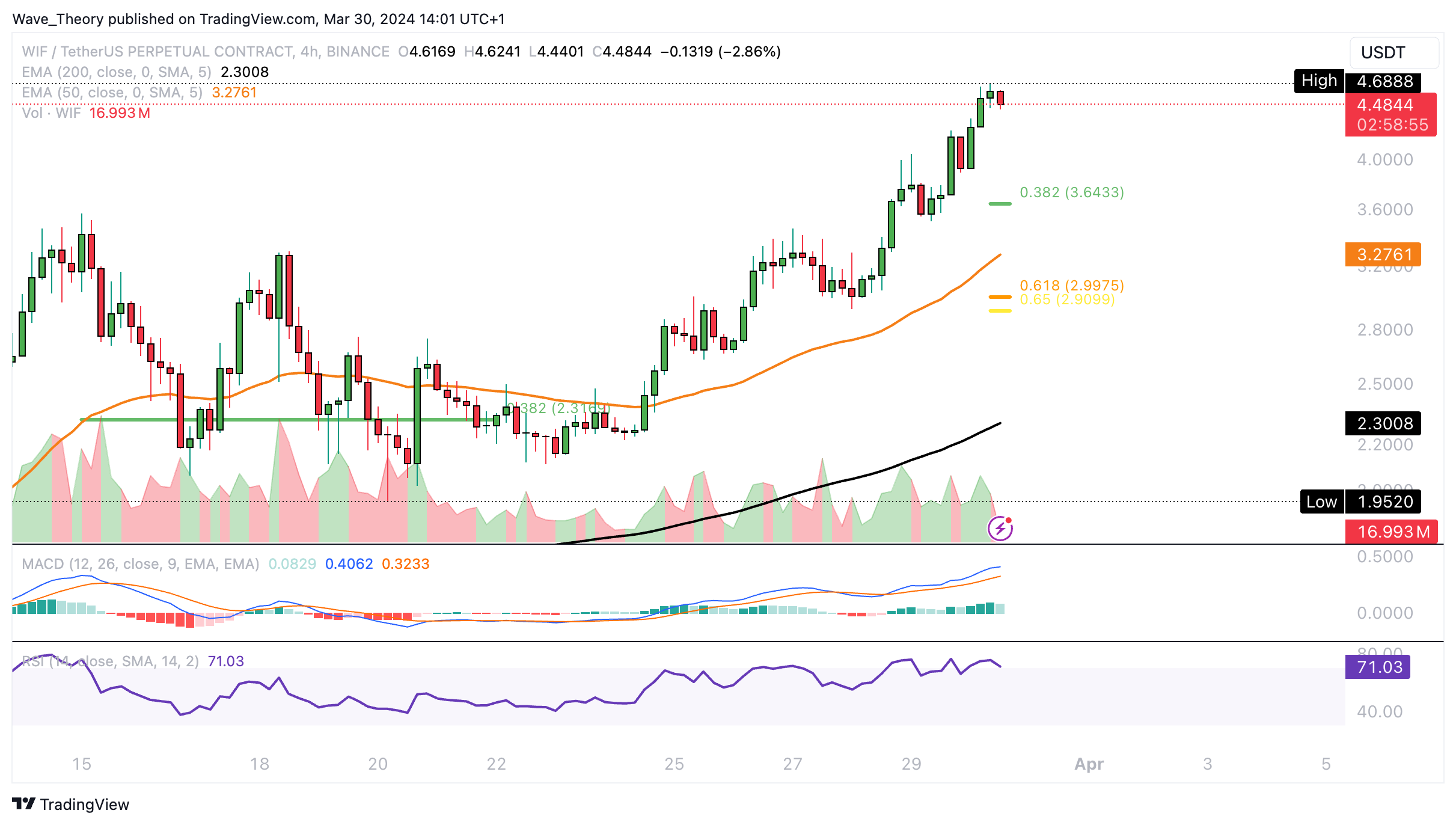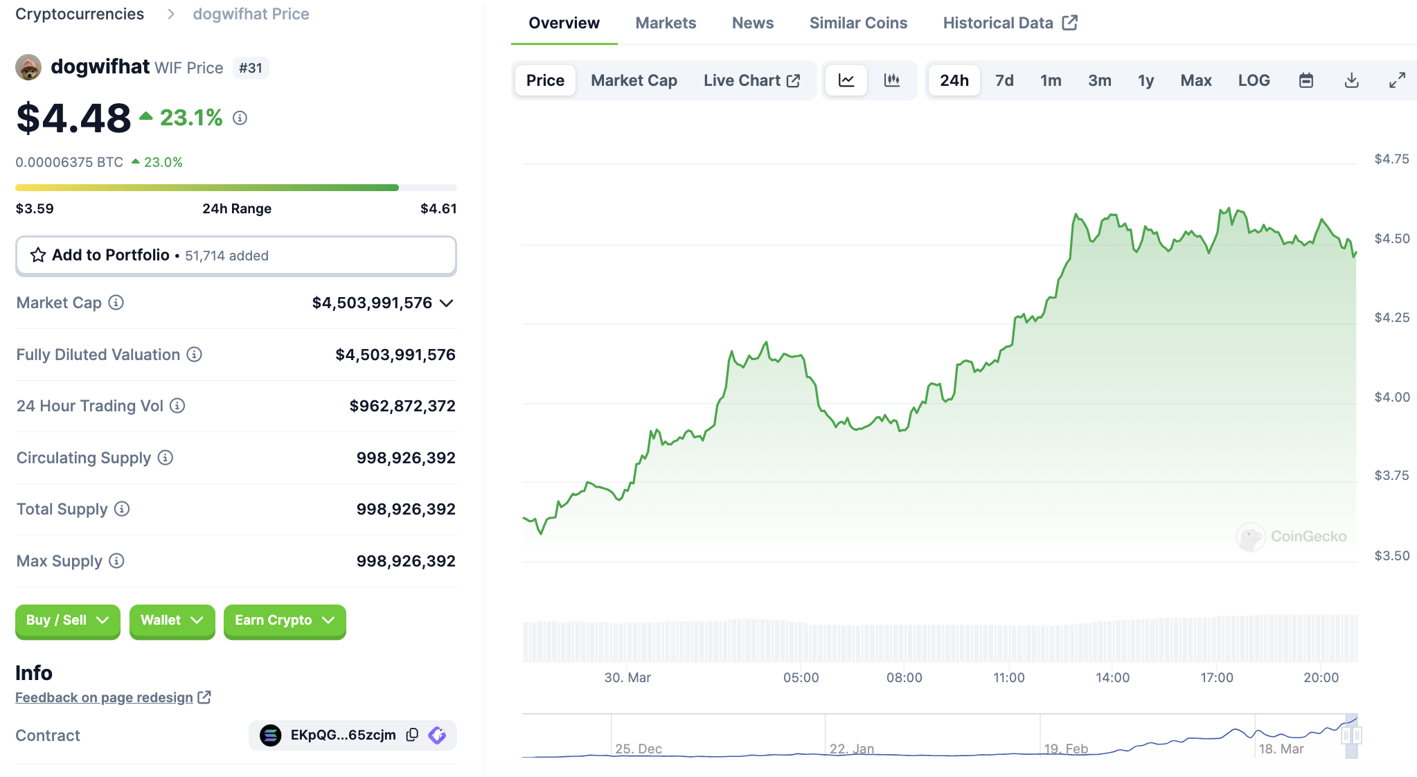Der Coin Dogwifhat (WIF) ist auf einigen Börsen verfügbar und verzeichnet momentan eine Marktkapitalisierung von etwa 4,5 Milliarden USD.
