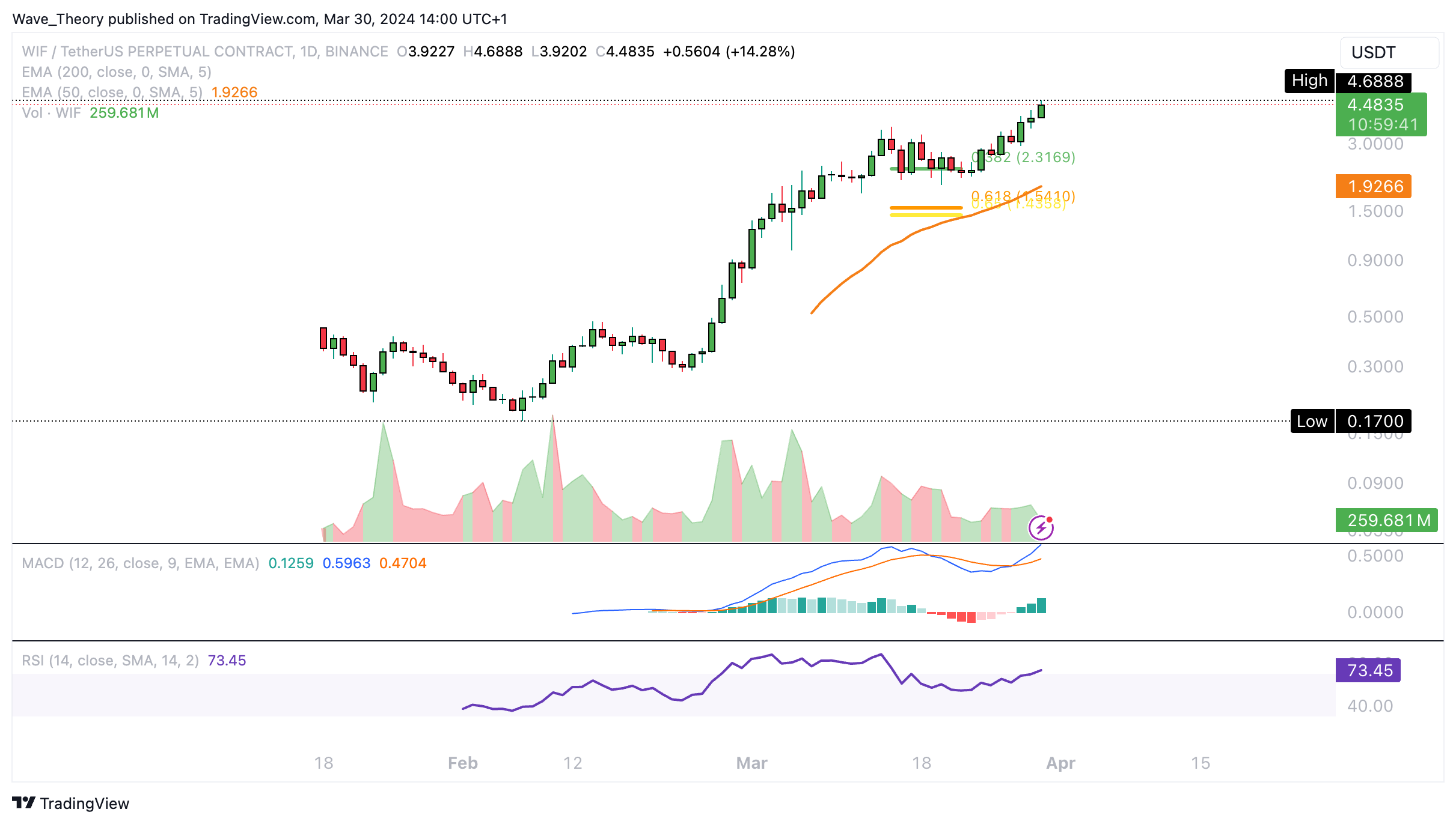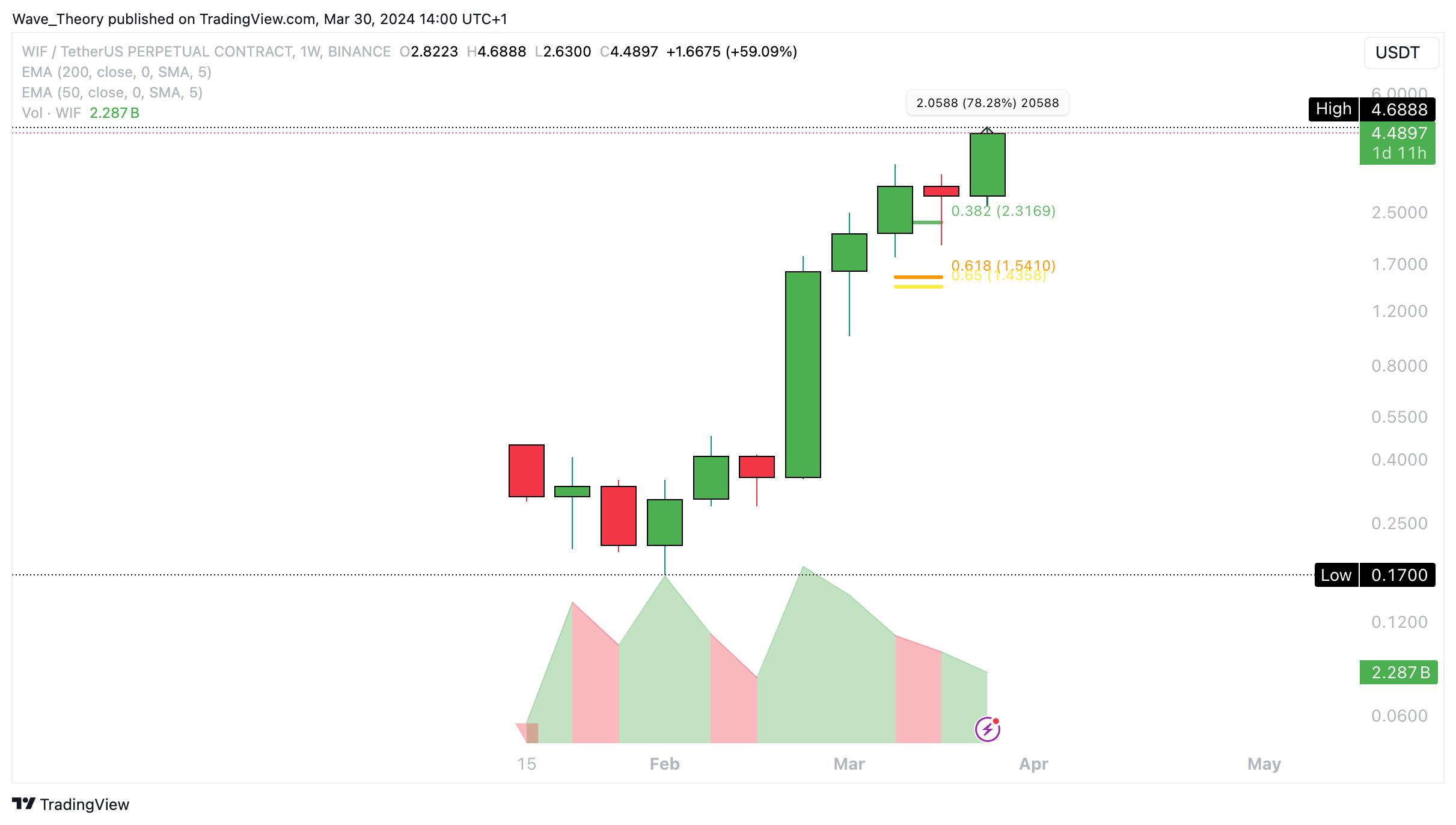 Dogwifhat (WIF) führt das Rennen der Top-Gewinner gepaart mit dem höchsten Handelsvolumen der letzten 24 Stunden