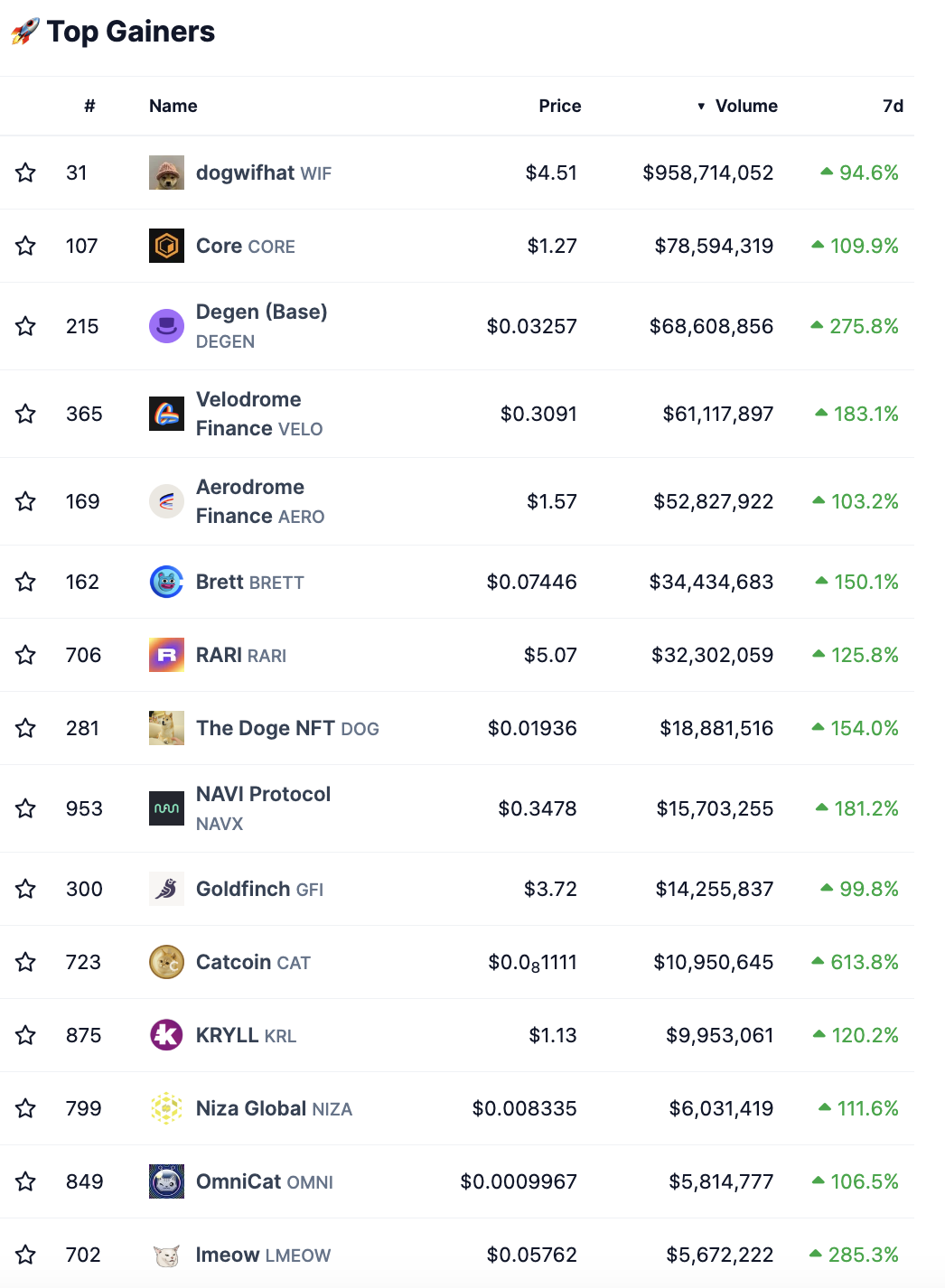 Unter den Top Kursgewinnen auf dem Krypto-Markt führt dogwifhat (WIF) mit einem Anstieg von 94,6 % in den letzten sieben Tagen und einem Handelsvolumen von fast 1 Milliarden USD.