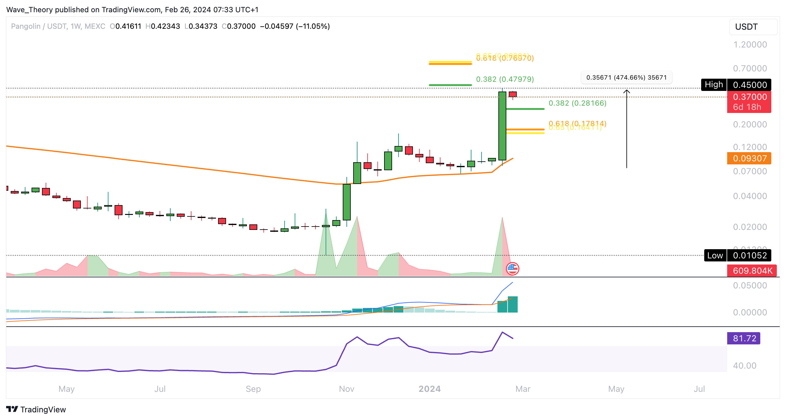 Nach unten hin findet Pangolin bereits bei rund 0,2816 USD und bei rund 0,17 USD signifikante Fib Unterstützungen. Ansonsten wartet am 50-Wochen-EMA bei rund 0,093 USD signifikante Unterstützung.