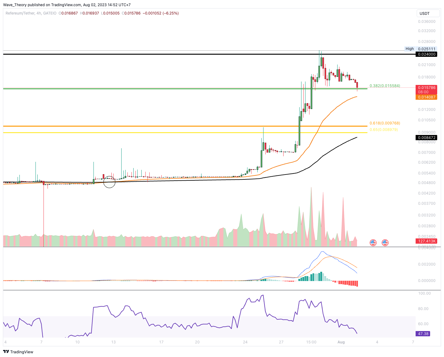 Damit initiierte der Refereum Kurs eine Korrektur, womit sich der Kurs jetzt an der 0,382 Fib Unterstützung bei rund 0,015584 USD befindet. Dort könnte der Kurs jetzt abprallen, um den Widerstand erneut ins Visier zu nehmen.