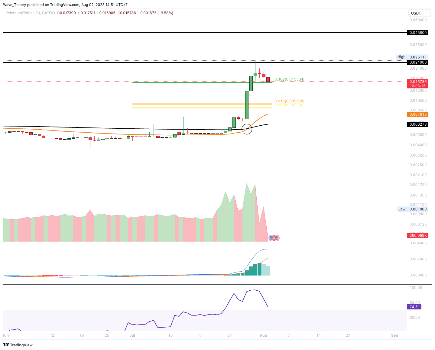 Damit zeigt auch der MACD eine bullische Entwicklung im Wochenchart. Das Histogramm des MACDs tickt bullisch höher und die MACD Linien sind bullisch überkreuzt. Der RSI befindet sich dabei in überkauften Regionen. Außerdem ist es sehr bullisch, dass der Refereum Kurs bereits den 50-Wochen-EMA Widerstand bei rund 0,007 USD überwinden konnte, woran der Kurs über Monate hinweg scheiterte.