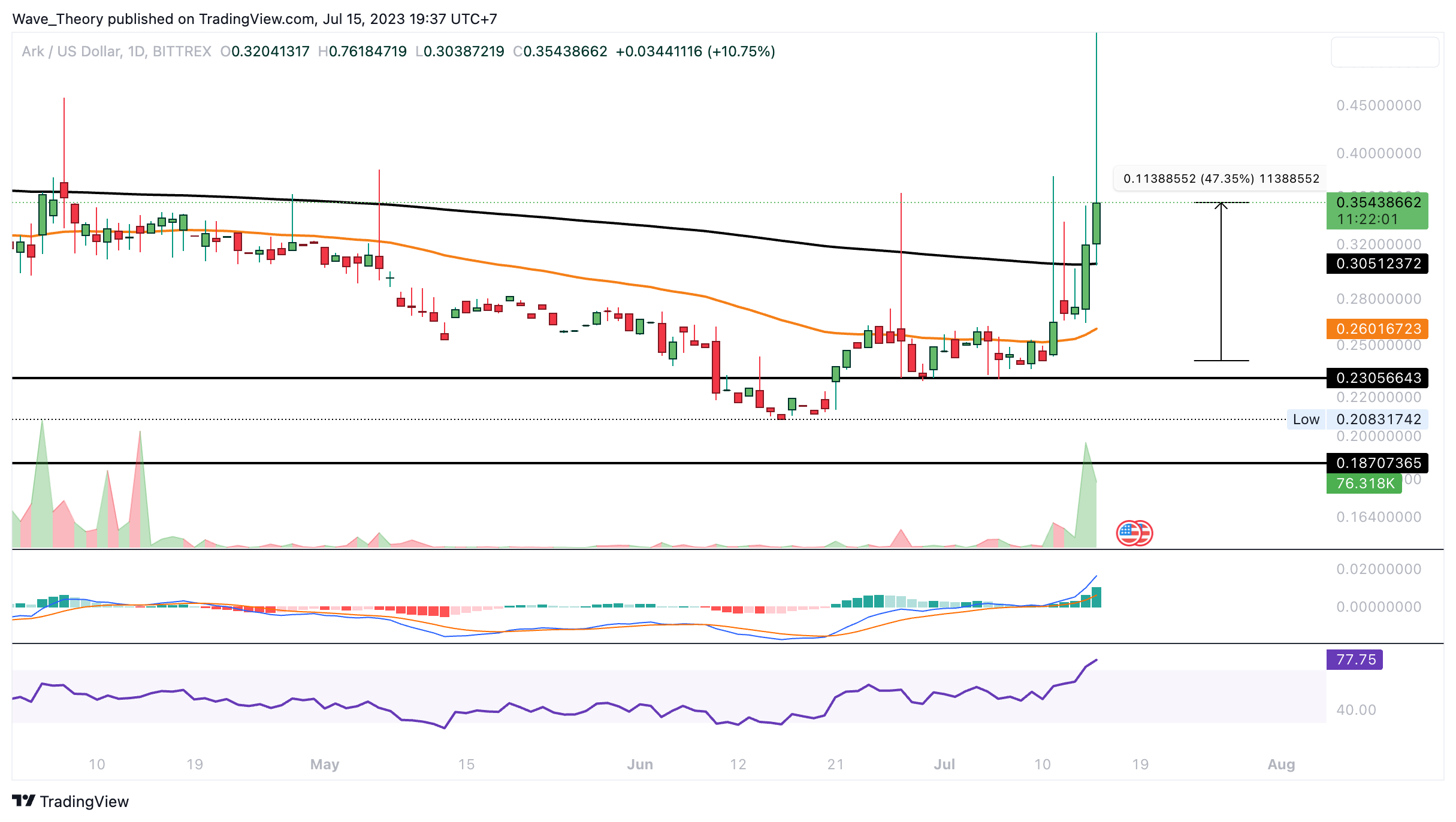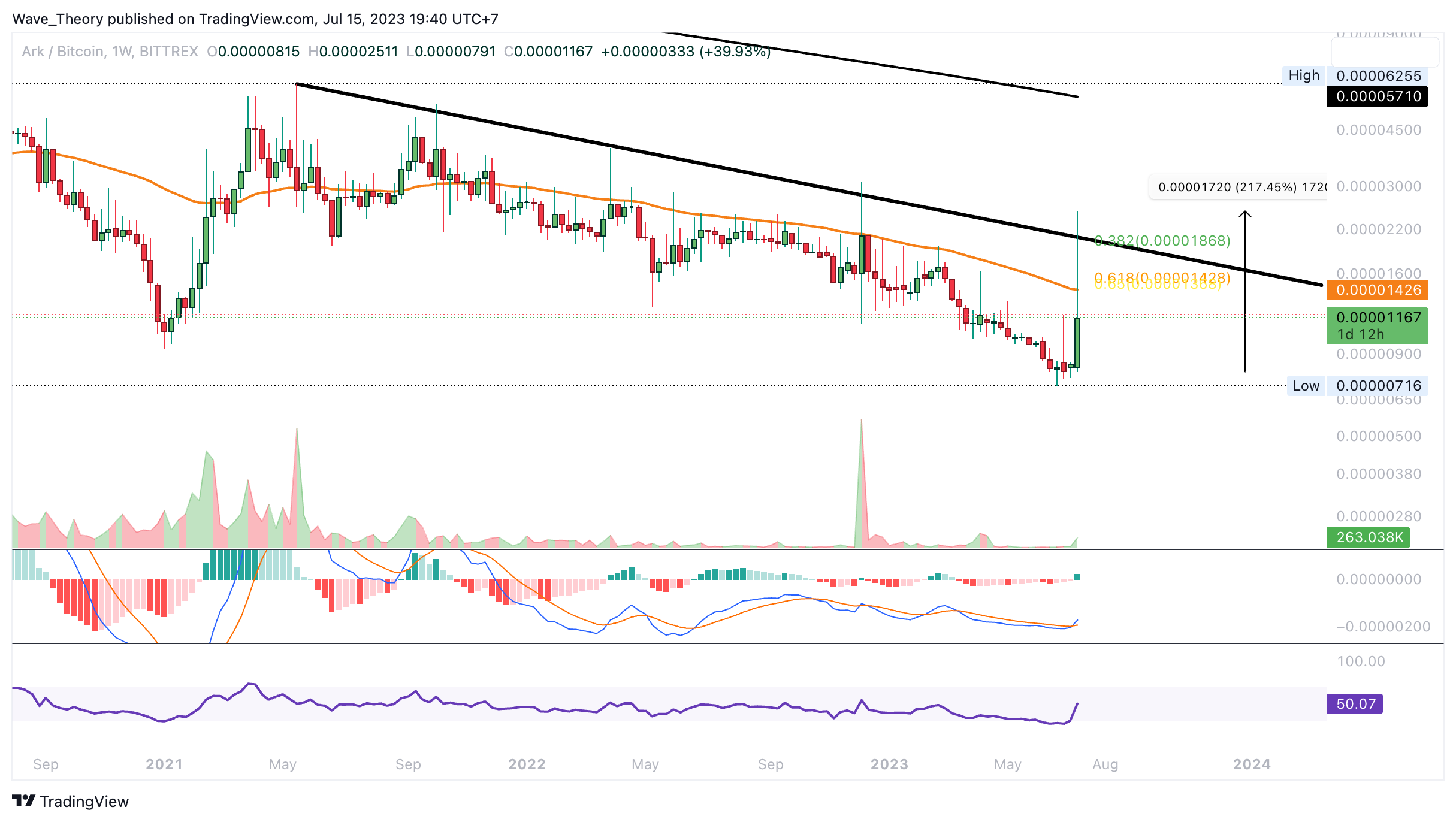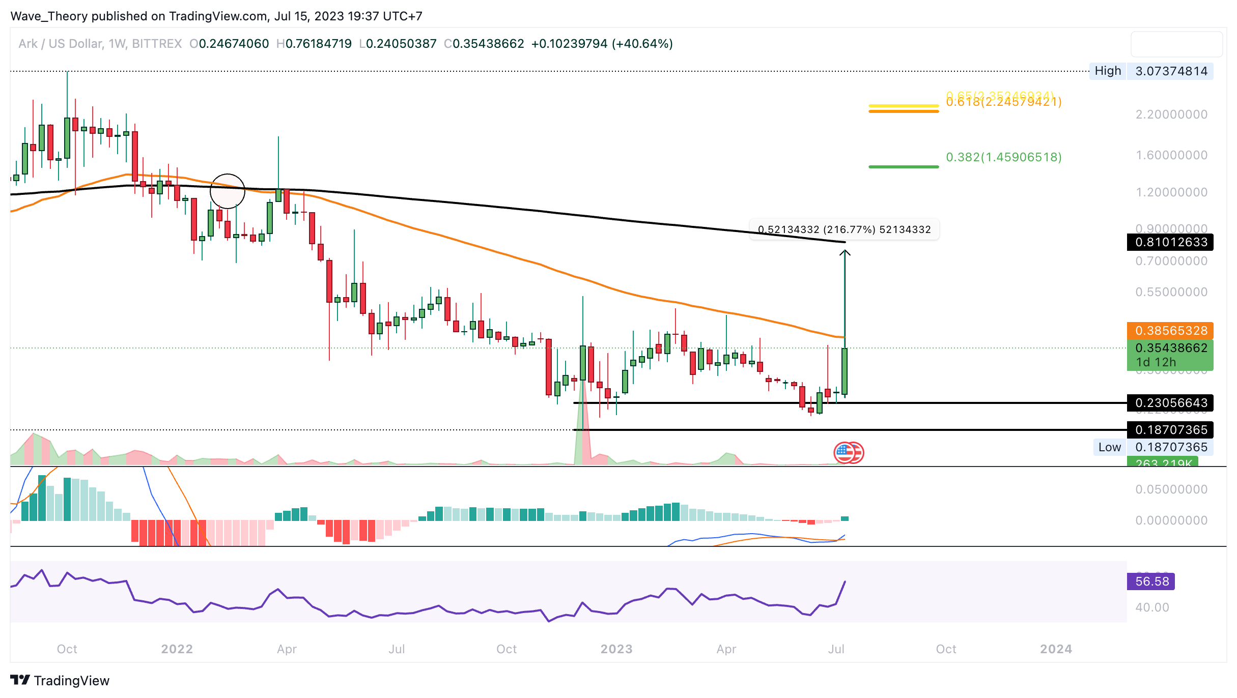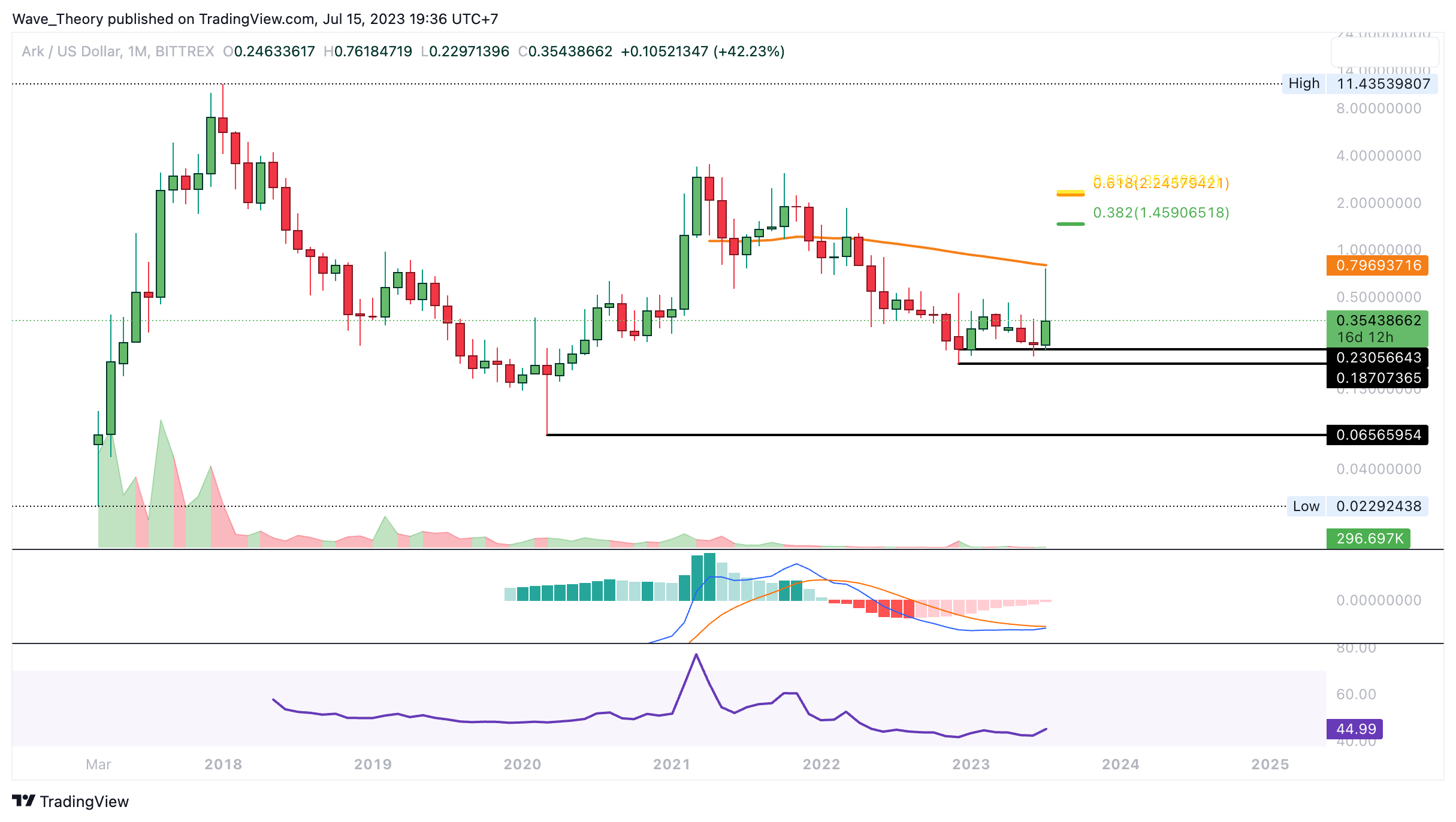 Im Monatschart wird deutlich, dass ARK letzten bzw. diesen Monat an der signifikanten Unterstützungszone zwischen rund 0,187 USD und 0,23 USD abprallen konnte. Doch ebenso deutlich wird es, dass ARK den 50-Monate-EMA bei rund 0,8 USD bisher nicht überwinden konnte.