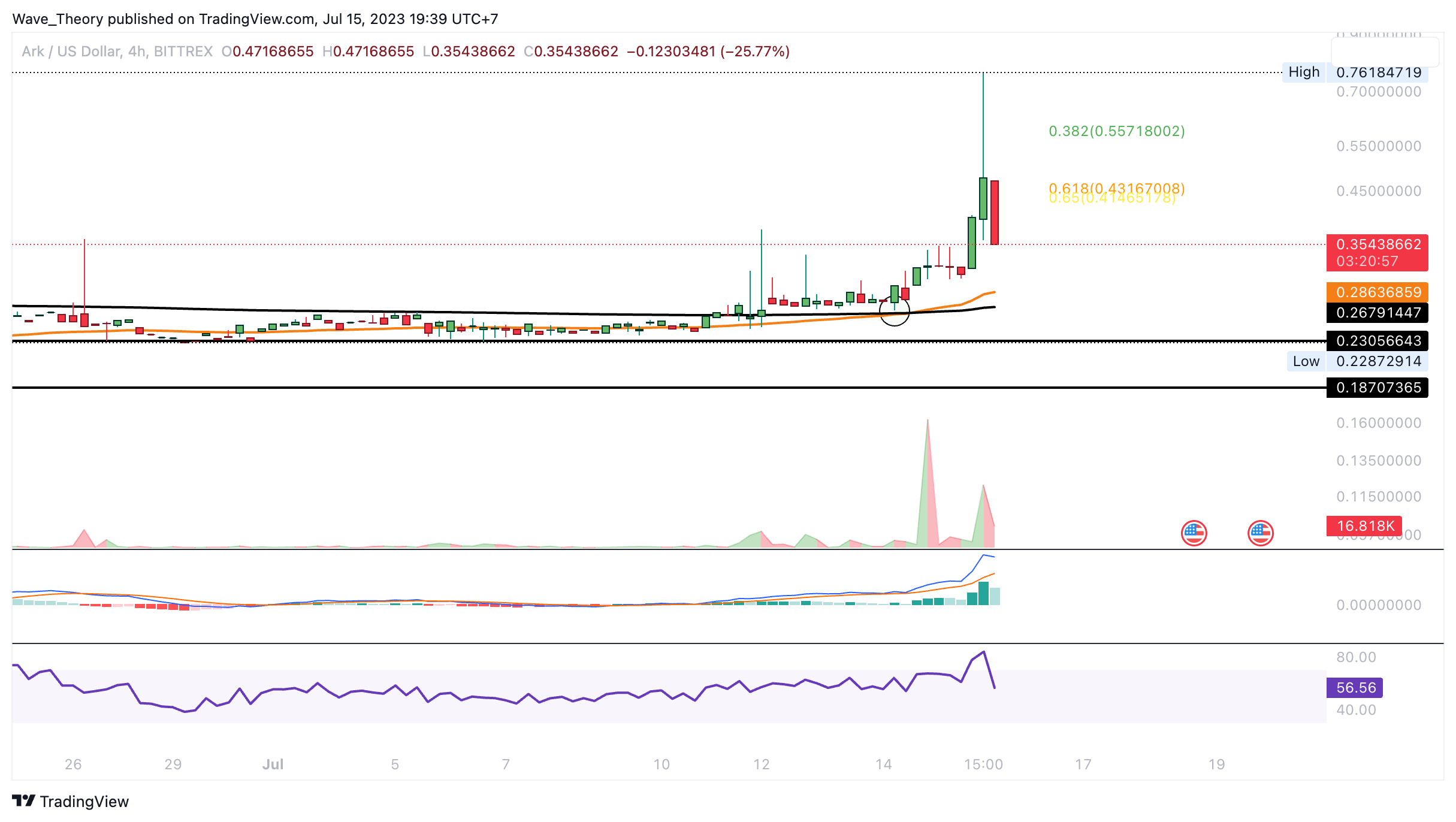Der ARK Kurs hat im Zuge der Korrekturbewegungen die nächsten Fib Unterstützungen bei rund 0,557 USD respektive 0,43 USD bereits bärisch durchbrochen. Damit wartet erst wieder zwischen rund 0,187 USD und 0,23 USD signifikante Unterstützung auf den ARK Coin.