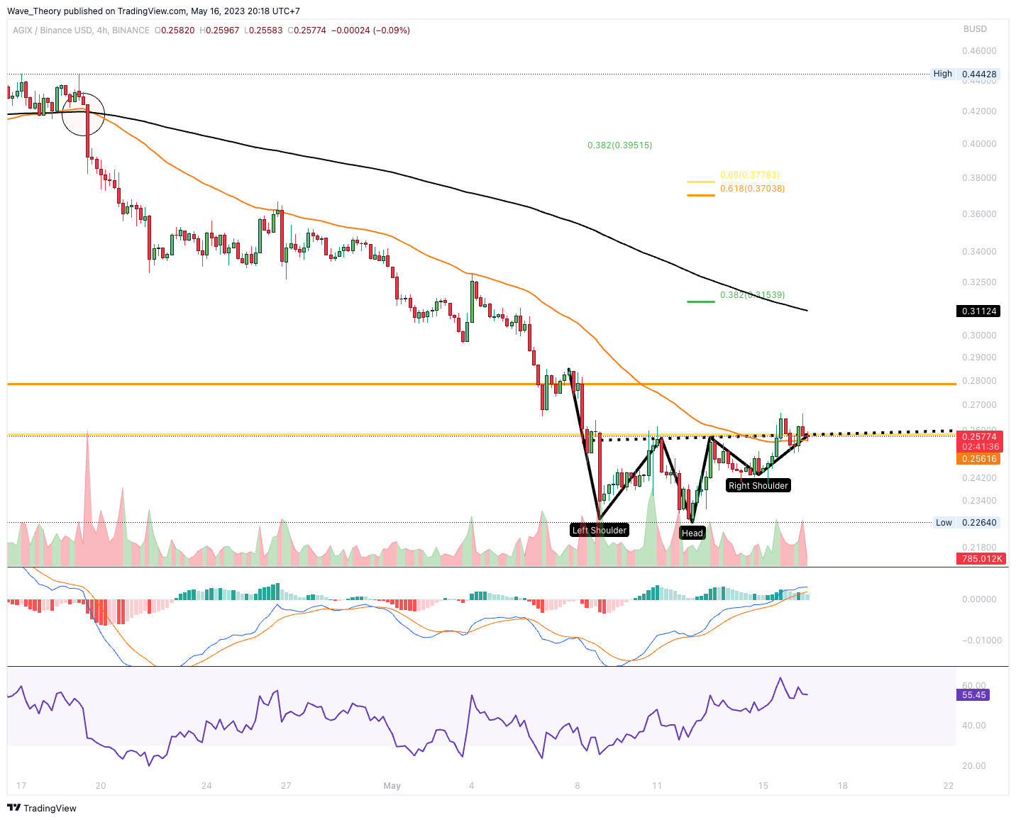 Im 4H-Chart liegt hingegen ein Death Cross vor, womit der Trend kurzfristig bärisch bestätigt ist. Jedoch zeichnet sich ein bullisches Inverse-Head-and-Shoulders Kursmuster ab, aus welchem der AGIX Kurs bullisch ausbrechen könnte. Dafür muss er das aktuelle Preisniveau von rund 0,26 USD nachhaltig übersteigen.