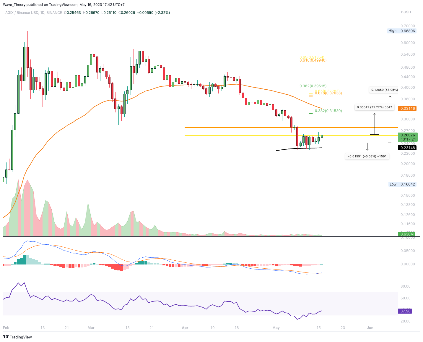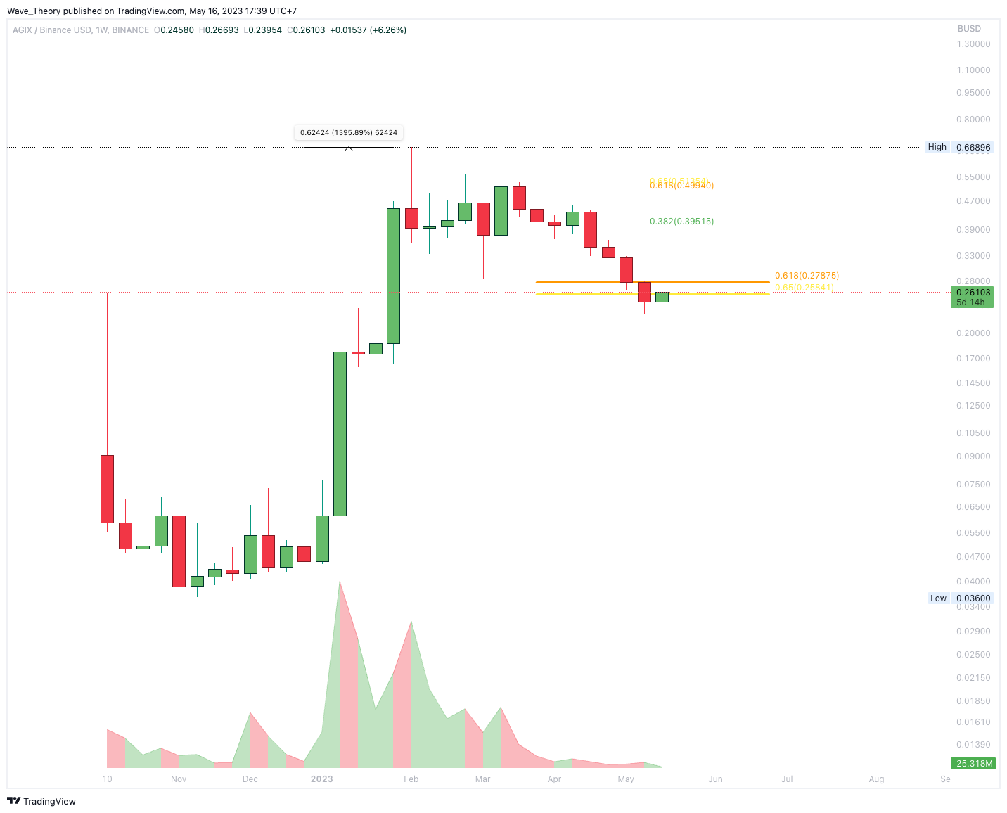 In Zuge der wochenlangen Korrekturbewegung erreichte der AGIX Kurs jetzt signifikante Golden Ratio Unterstützung bei rund 0,26 USD, woran AIGX jetzt bullisch abprallen könnte. Das Handelsvolumen gibt dabei aber eher ein bärisches Signal, denn dieses ist in den letzten drei Monaten sehr stark zurückgegangen.