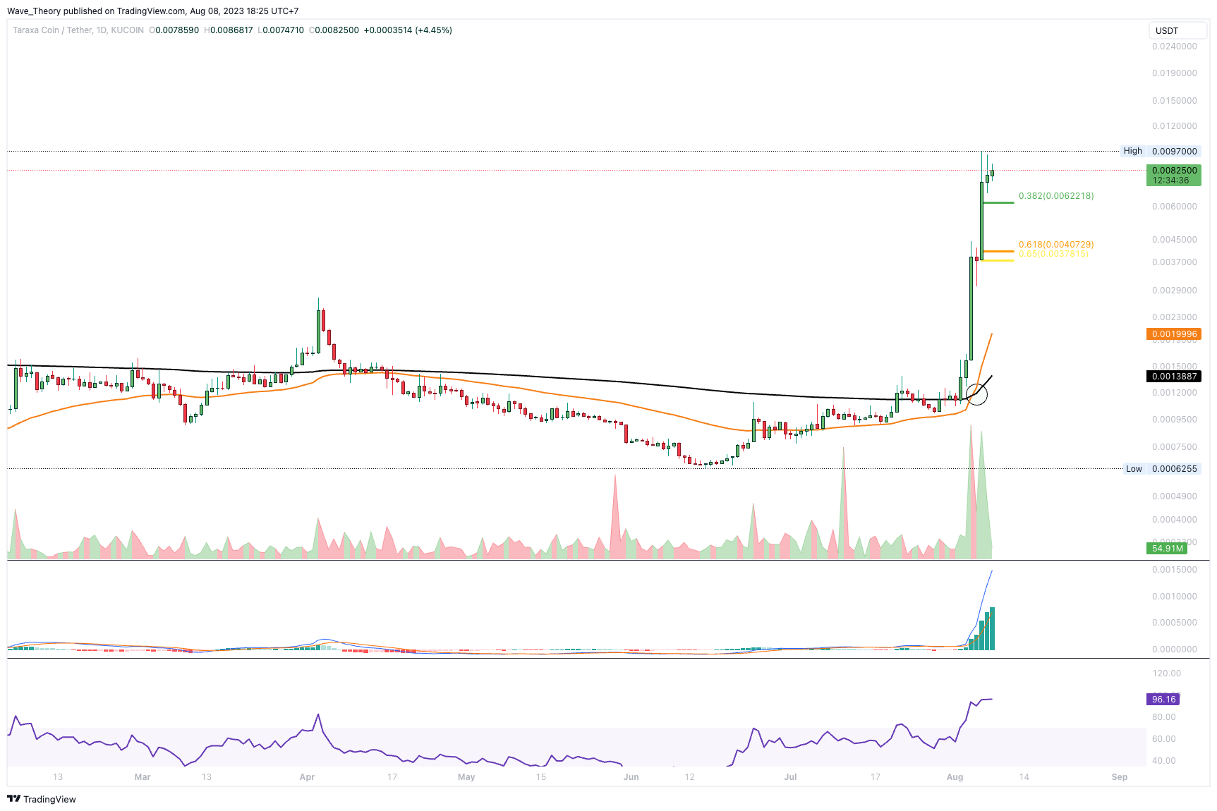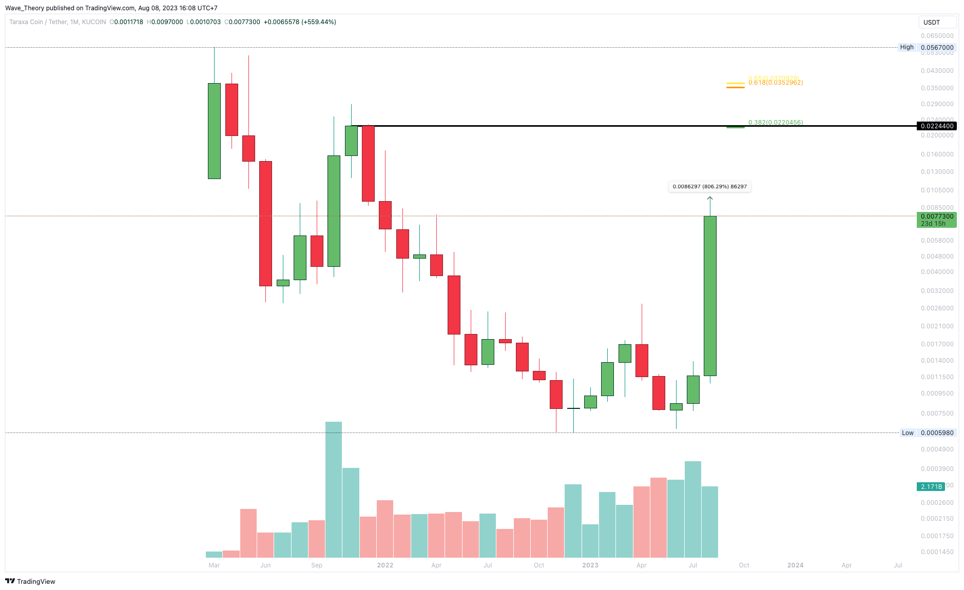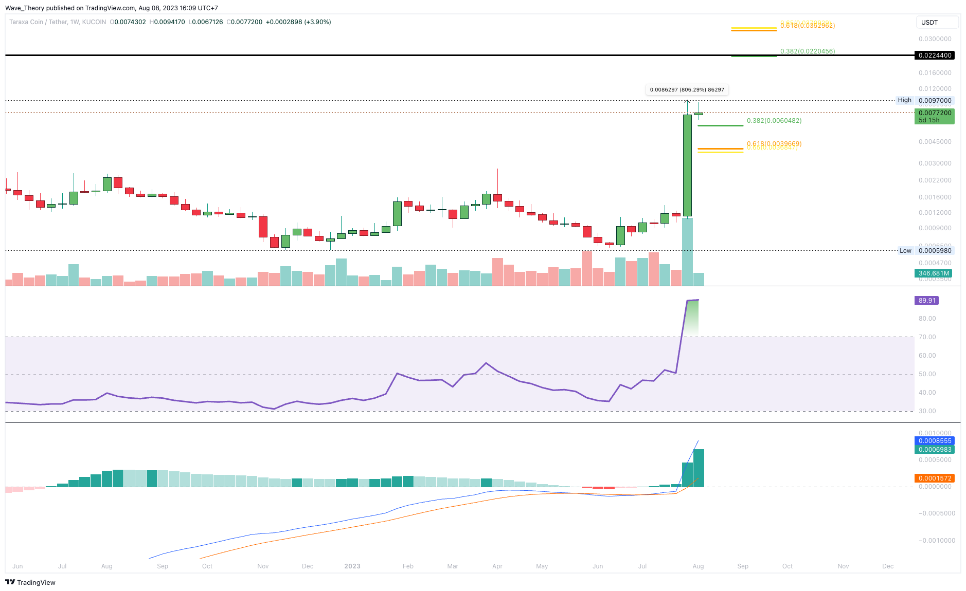 Dieser Coin ist letze Woche über 806 % im Kurs gestiegen. Es handelt sich dabei um den Coin Taraxa (TARA). Der Taraxa Coin hat dabei noch mehr Aufwärtspotenzial, denn erst bei rund 0,022 USD stößt der TARA Kurs auf signifikanten Fib Widerstand. Bricht der Coin diesen Widerstand, wartet an der Golden Ratio bei rund 0,035 USD der nächste signifikante Fib Widerstand.