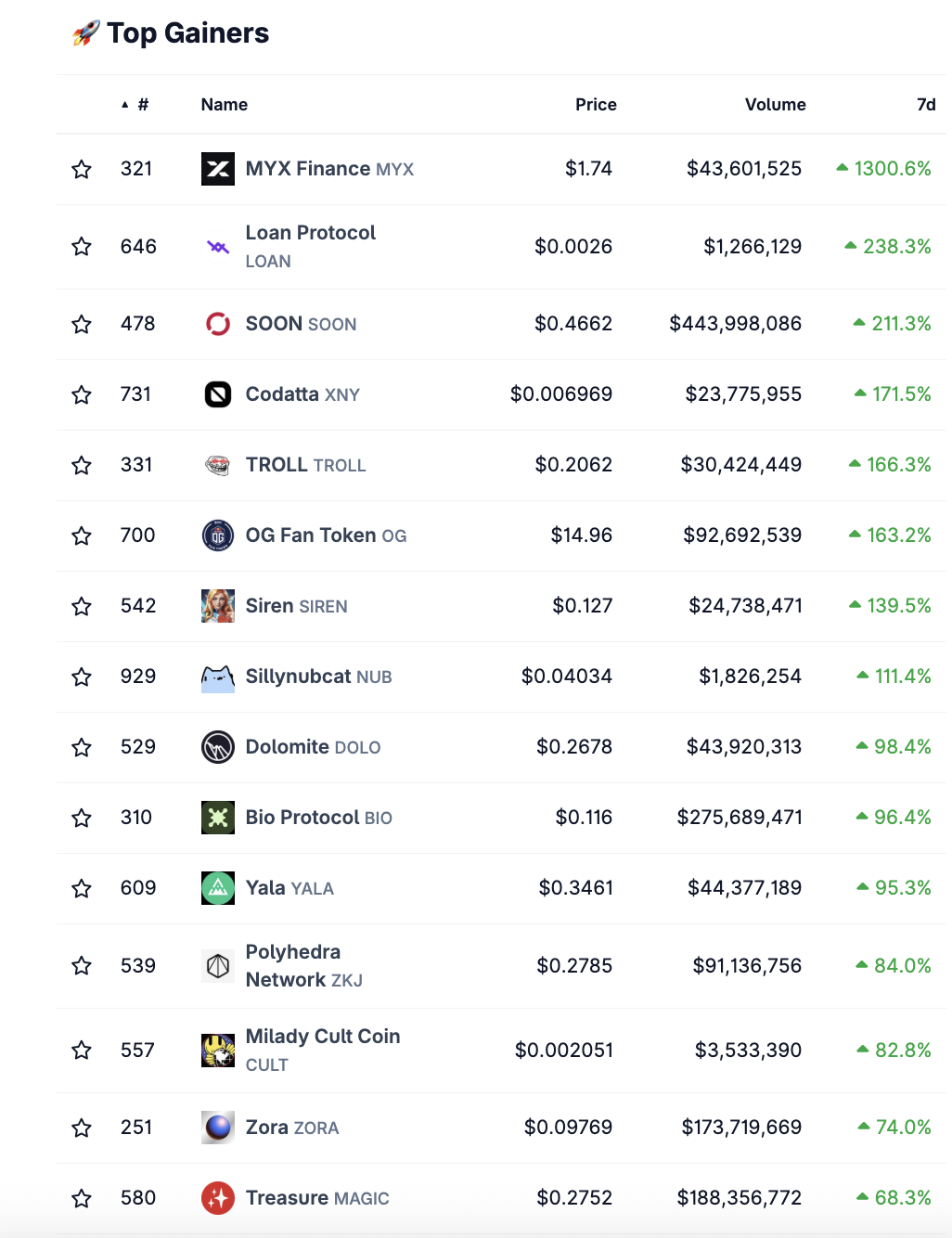 Der Coin MYX Finance (MYX) belegt in dieser Woche den ersten Platz der Top-Gewinner auf dem Krypto-Markt. Laut Coingecko ist der Coin in den letzten sieben Tagen rund 1.300 % im Kurs gestiegen.