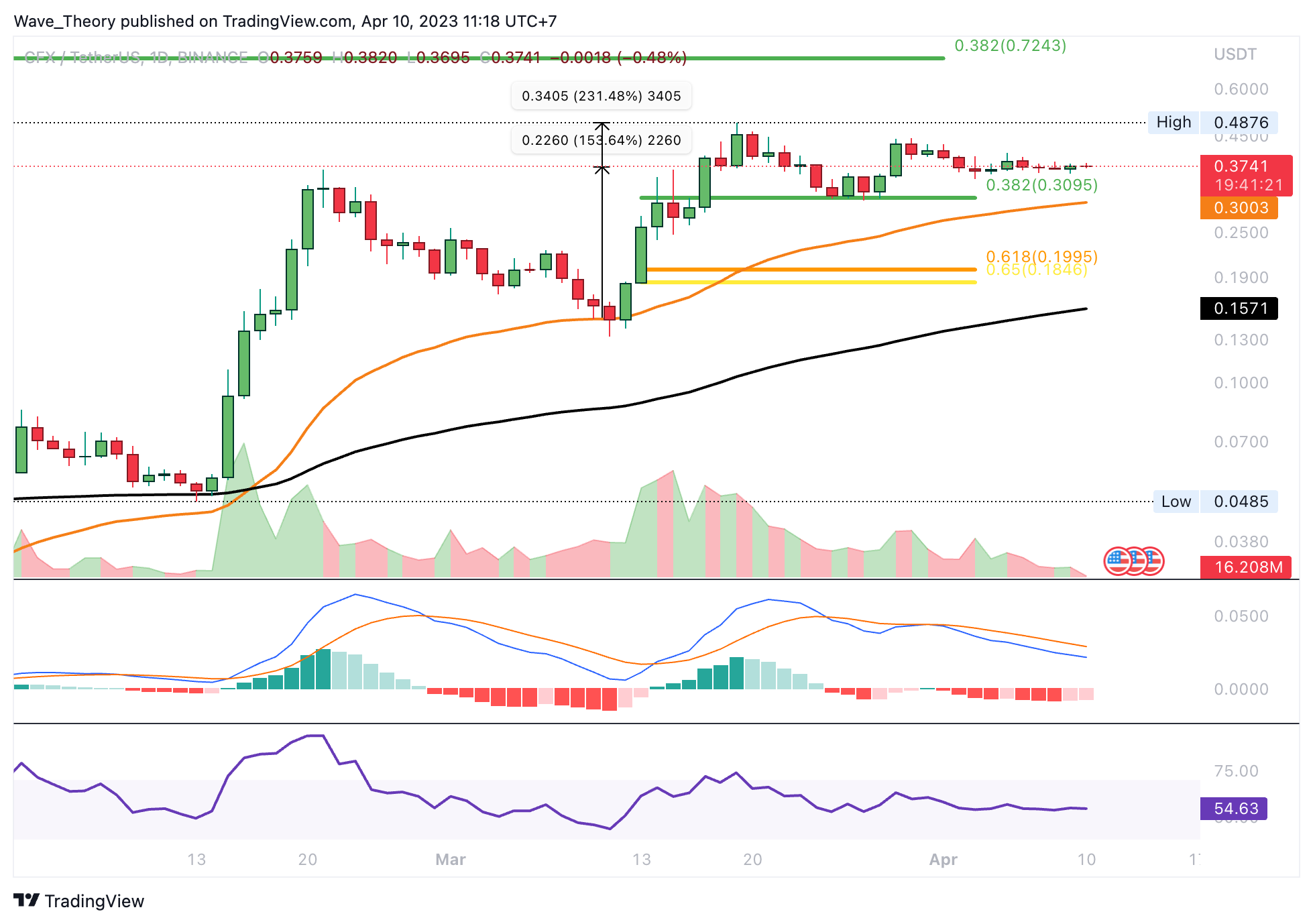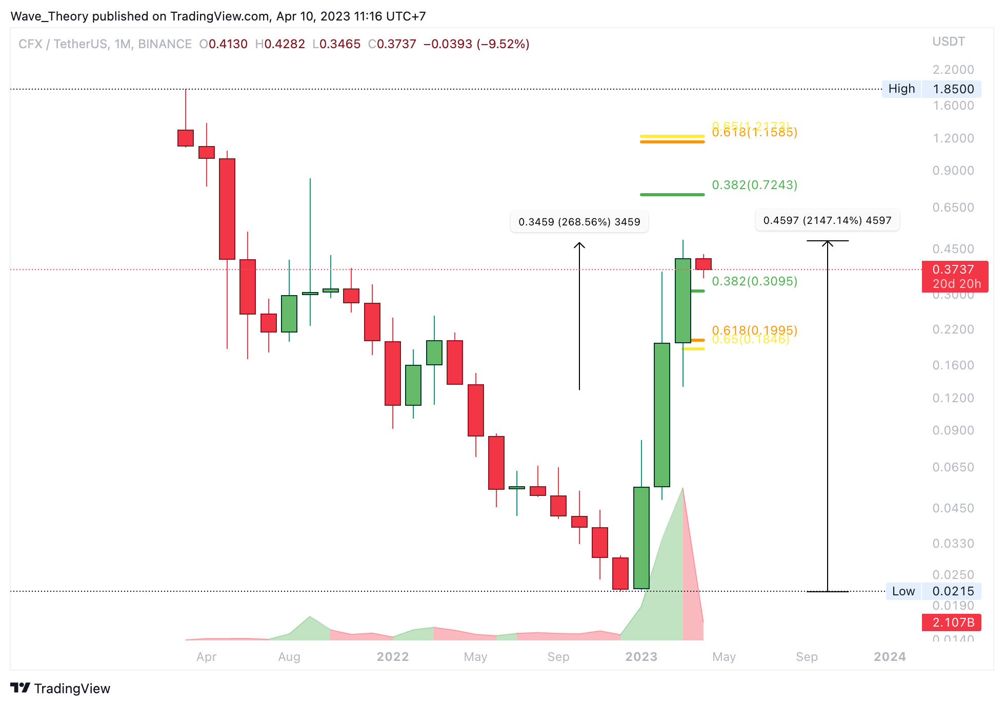 Ganz im Gegenteil, Conflux stieg beständig über die letzten drei Monate hinweg und verbuchte dabei alleine letzten Monat ein Kursgewinn von rund 270 %. Doch in diesem Monat scheint der CFX Kurs nun eine Korrektur einzuleiten. Wenn Conflux die Korrektur beenden wird, findet Conflux bei rund 0,724 USD und bei rund 1,2 USD die nächsten signifikanten Fib Widerstände.