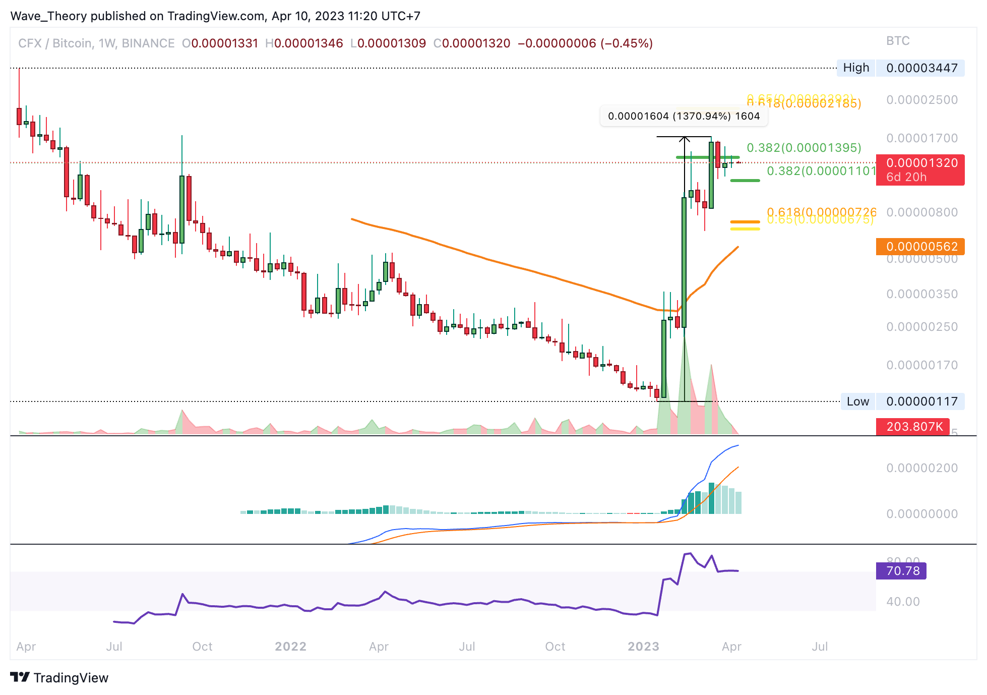 Gegen BTC ist der CFX Kurs seit Jahresbeginn rund 1.370 % gestiegen. Auch hier befindet sich CFX derzeit in einer Korrekturbewegung. CFX findet jetzt bei rund 0,000011 BTC und bei rund 0,000007 BTC die nächsten signifikanten Fib Unterstützungen.