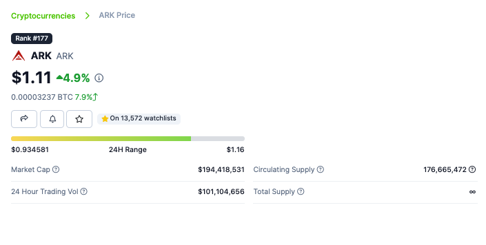 Es handelt sich dabei um den Token ARK (ARK). Dieser weist derzeit eine Marktkapitalisierung von rund 200 Millionen USD auf. Damit bewegt sich der Token auf Rang 177 im Marktkapitalisierungsranking. Das tägliche Handelsvolumen liegt dabei bei knapp 100 Millionen USD, was relativ zur Marktkapitalisierung sehr hoch ausfällt.