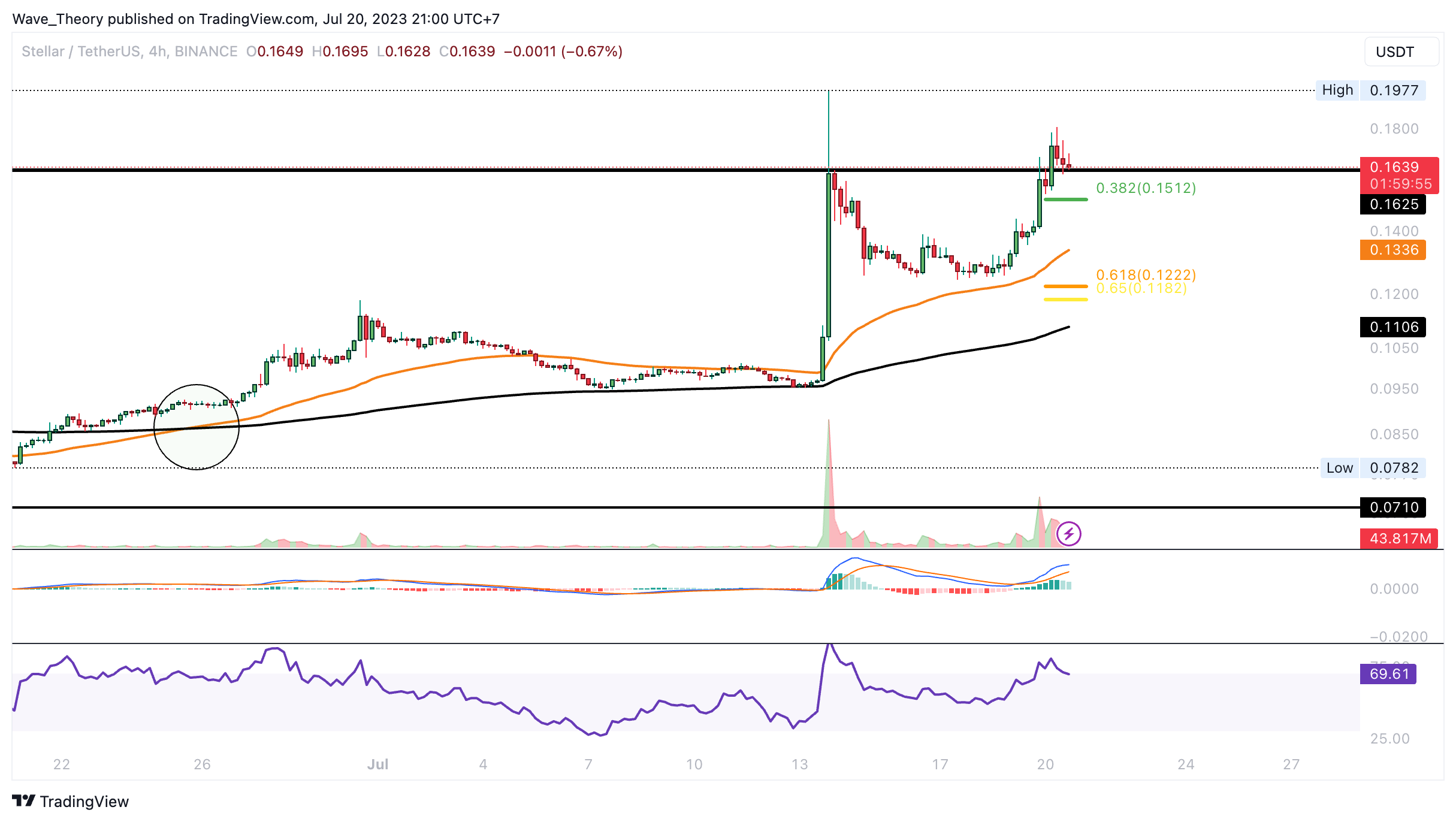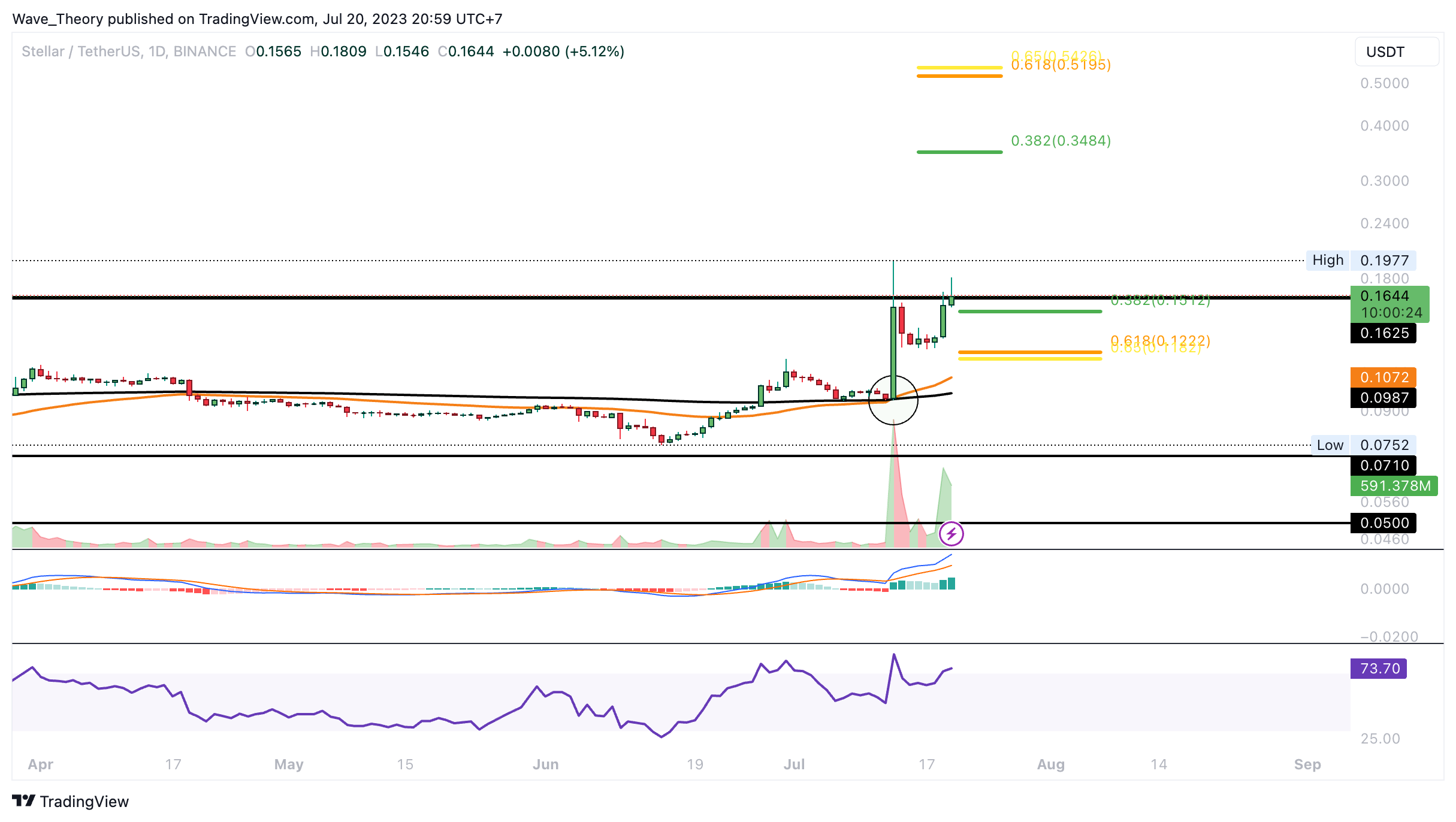Die Korrekturbewegung könnte aber bereits an einem der Fib Unterstützungen ihr Ende finden. Denn bereits bei rund 0,1512 USD respektive 0,12 USD stößt der Stellar Lumens Kurs auf signifikante Fib Unterstützungen. Darüber hinaus sind die MACD Linien bullisch überkreuzt und auch im 4H-Chart liegt ein Golden Crossover vor, womit der Trend auch kurzfristig bullisch bestätigt ist. Jedoch tickt das Histogramm des MACDs bereits bärisch tiefer und der RSI grenzt an überkauften Regionen.