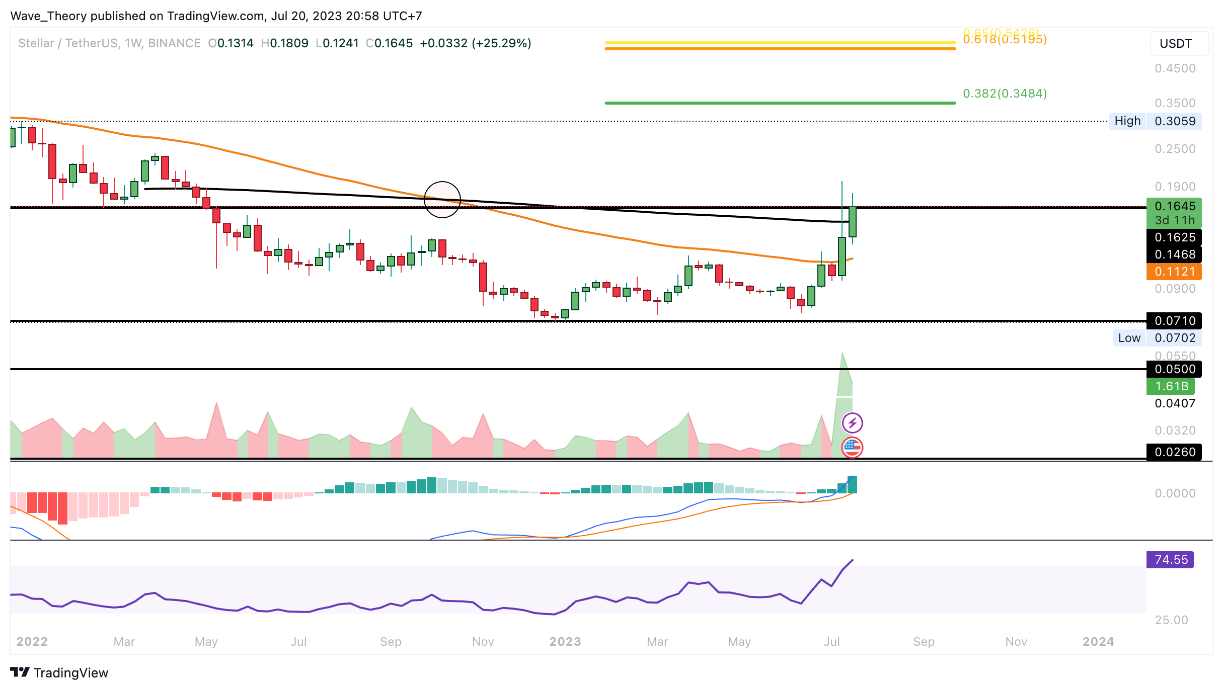 Zuvor konnte der Token an der signifikanten Unterstützungszone zwischen rund 0,05 USD und 0,071 USD abprallen. Damit befindet sich Stellar Lumens jetzt an horizontalem Widerstand bei rund 0,1625 USD, wobei der 50-Monate-EMA bei rund 0,15 USD als zusätzlicher Widerstand fungiert.