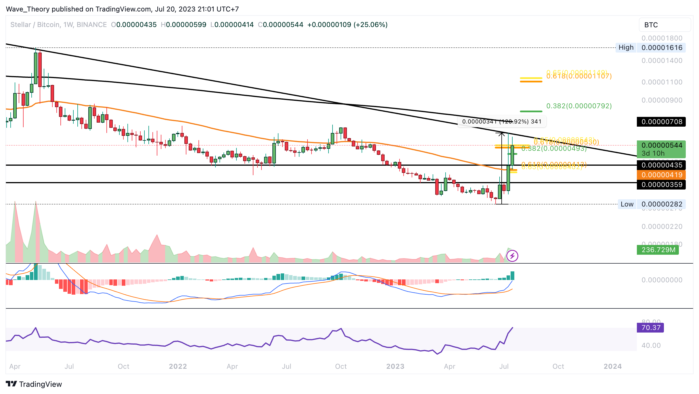 Zudem stößt der XLM Kurs jetzt auf signifikanten Golden Ratio Widerstand bei rund 0,0000055 BTC. Dort könnte Stellar Lumens jetzt bärisch abgewiesen werden, um zu den nächsten Fib Unterstützungen bei rund 0,0000493 BTC respektive 0,000041 BTC zu korrigieren. Bei rund 0,000042 BTC fungiert zudem der 50-Wochen-EMA als zusätzliche Unterstützung.