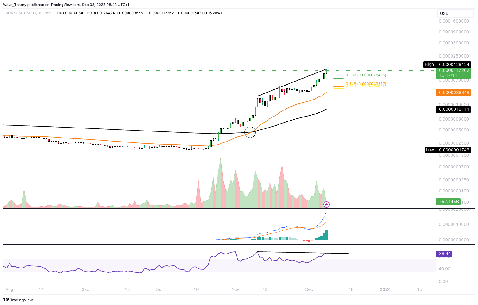 Auf den Bonk Kurs warten keine weiteren Widerstände. Dennoch befindet sich der RSI im Wochenchart in stark überkauften Regionen.