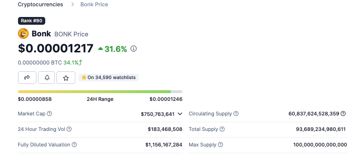 Es handelt sich dabei um den Token Bonk (BONK). Dieser weist derzeit eine Marktkapitalisierung von rund 750 Millionen USD auf. Damit bewegt sich der Token auf Rang 80 im Marktkapitalisierungsranking. Das tägliche Handelsvolumen liegt dabei bei rund 183 Millionen USD, was im Verhältnis zur Marktkapitalisierung normal ausfällt.