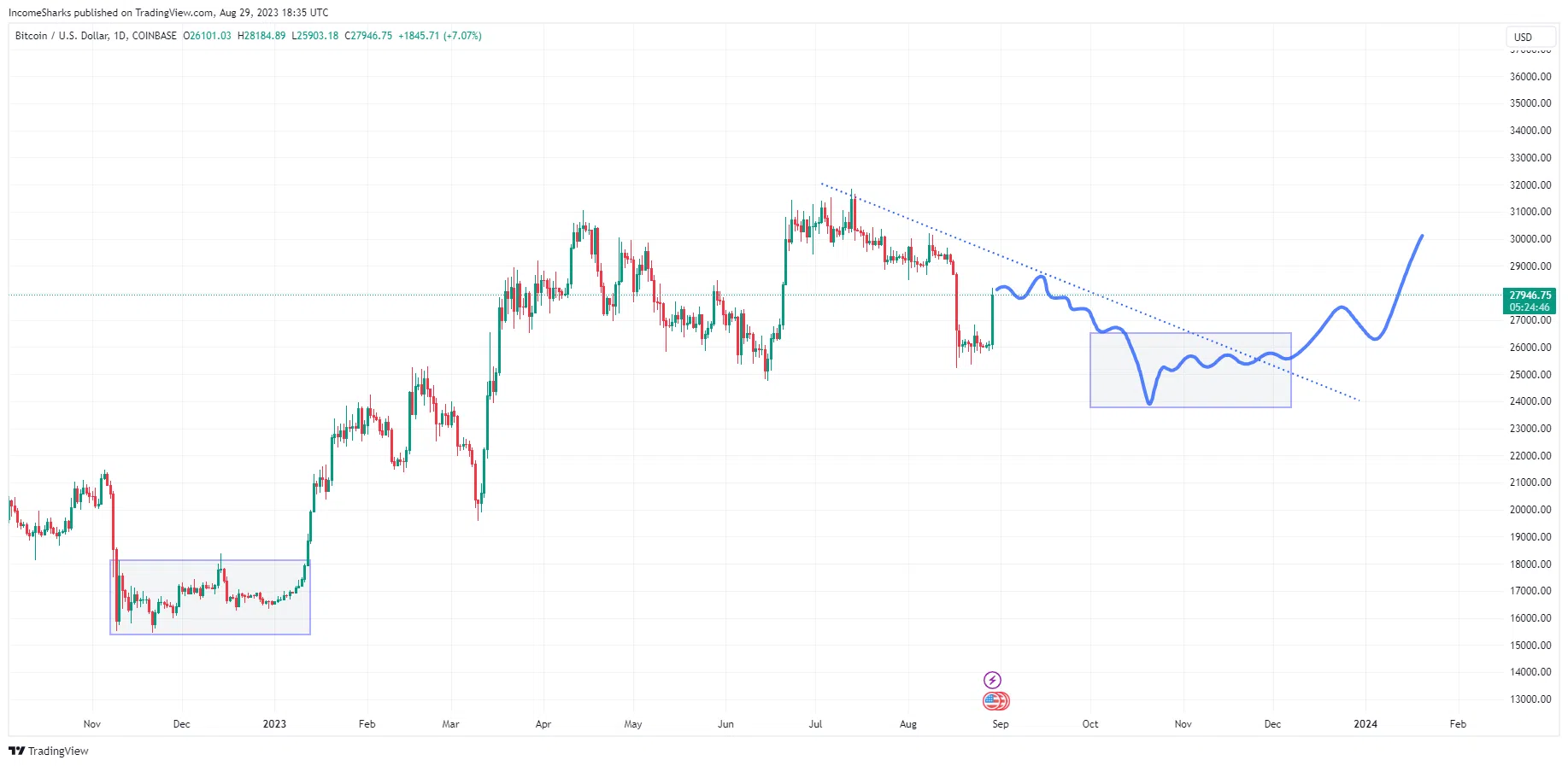 Aktuell scheint die Annahme verbreitet, dass wir erneut rückläufige Kurse gefolgt von einer mehrmonatigen Konsolidierung zwischen 25.000 und 26.000 USD erwarten können.