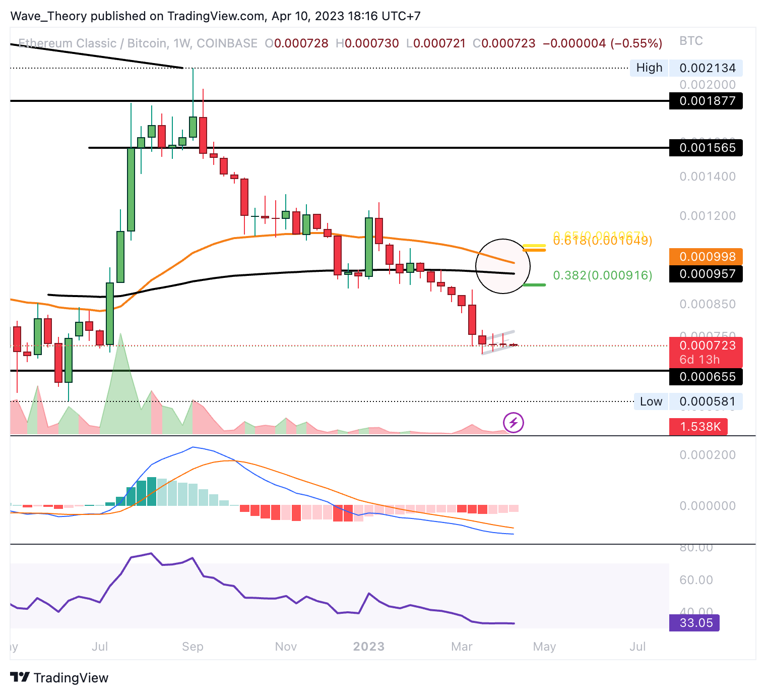 Sollte ETC jetzt im Kurs steigen, warten bereits bei rund 0,000916 BTC und bei rund 0,00105 BTC die nächsten signifikanten Fib Widerstände.