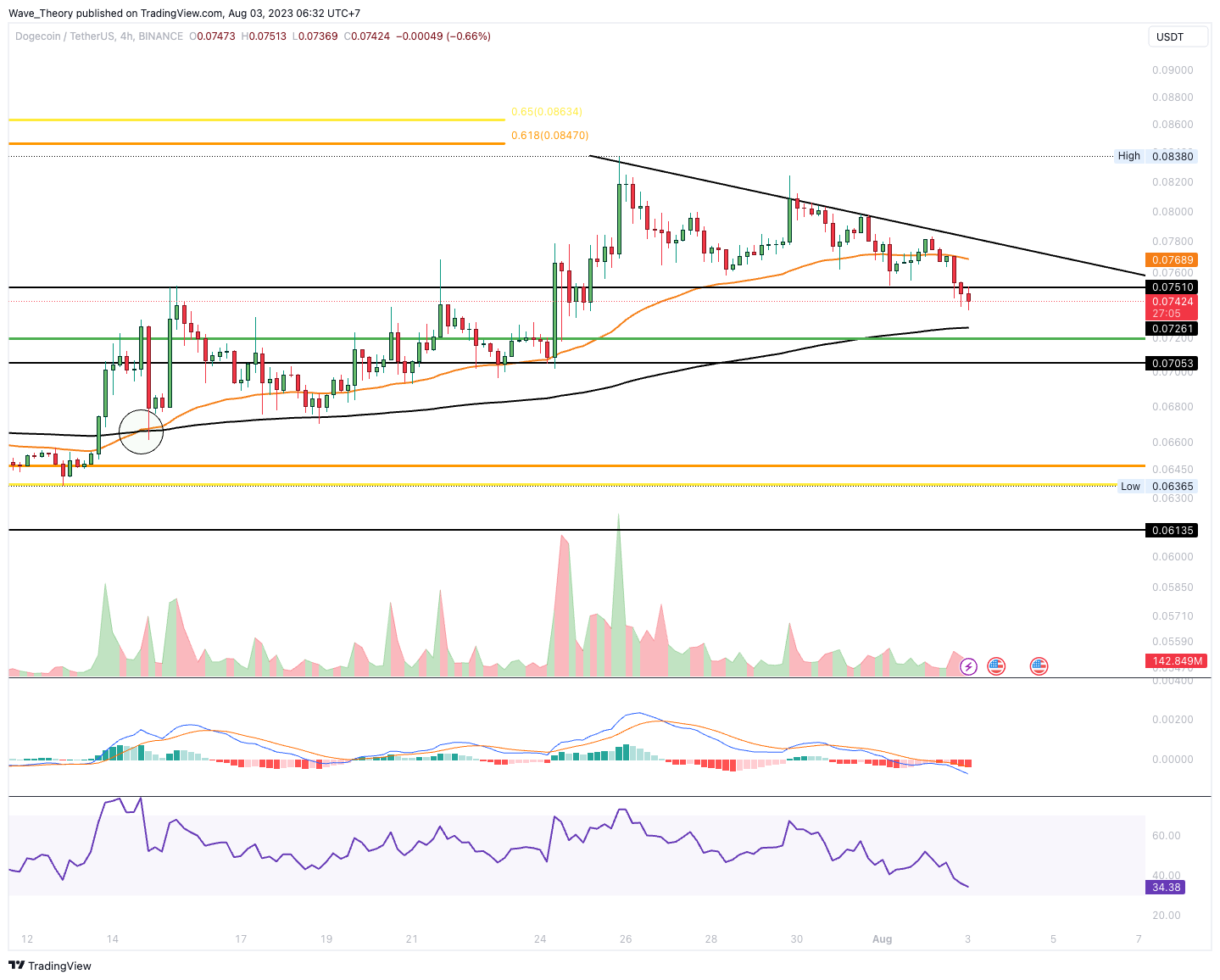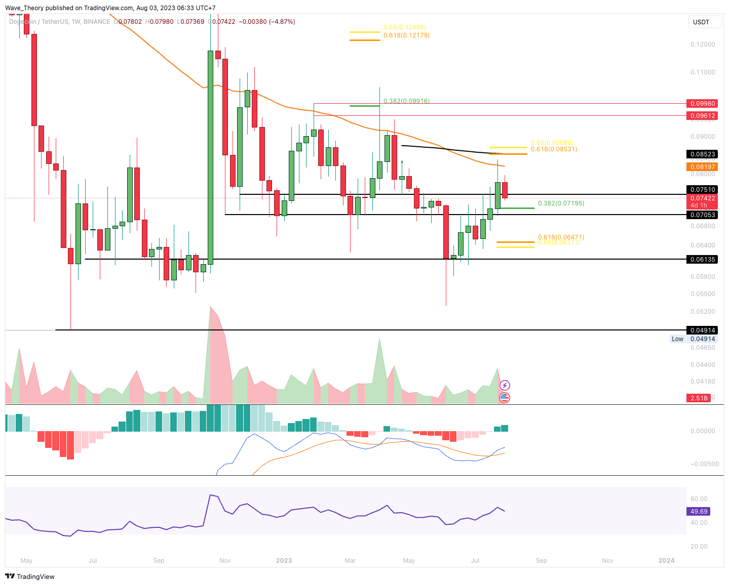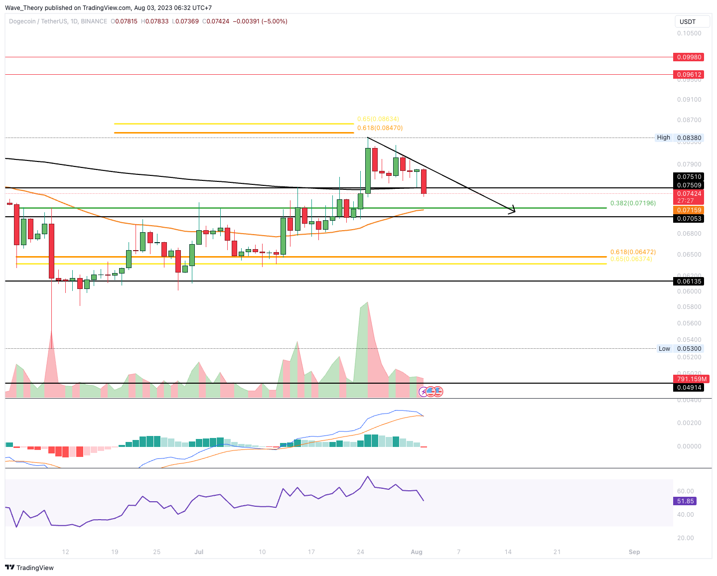 Der Dogecoin Kurs konnte den Golden Ratio Widerstand bei rund 0,085 USD nicht überwinden. Stattdessen setzte der Kurs zur Korrektur an und befindet sich seit einigen Tagen in einer Abwärtsbewegung. Damit könnte der DOGE Kurs jetzt zur 0,382 Fib Unterstützung zwischen rund 0,0716 USD und 0,072 USD korrigieren, wo der 50-Tage-EMA als zusätzliche Unterstützung dient.