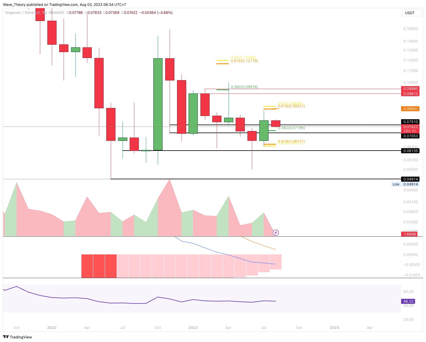 Der Juli verlief sehr bullisch für den Dogecoin Kurs. Des Weiteren tickt das Histogramm des MACDs seit vielen Monaten bullisch höher, womit sich auch die MACD Linien bald bullisch überkreuzen könnten. Währenddessen bewegt sich der RSI in neutralem Gebiet und gibt weder bullische noch bärische Signale. Nichtsdestoweniger konnte DOGE den Golden Ratio Widerstand bei rund 0,085 USD nicht überwinden, womit der Abwärtstrend intakt bleibt.