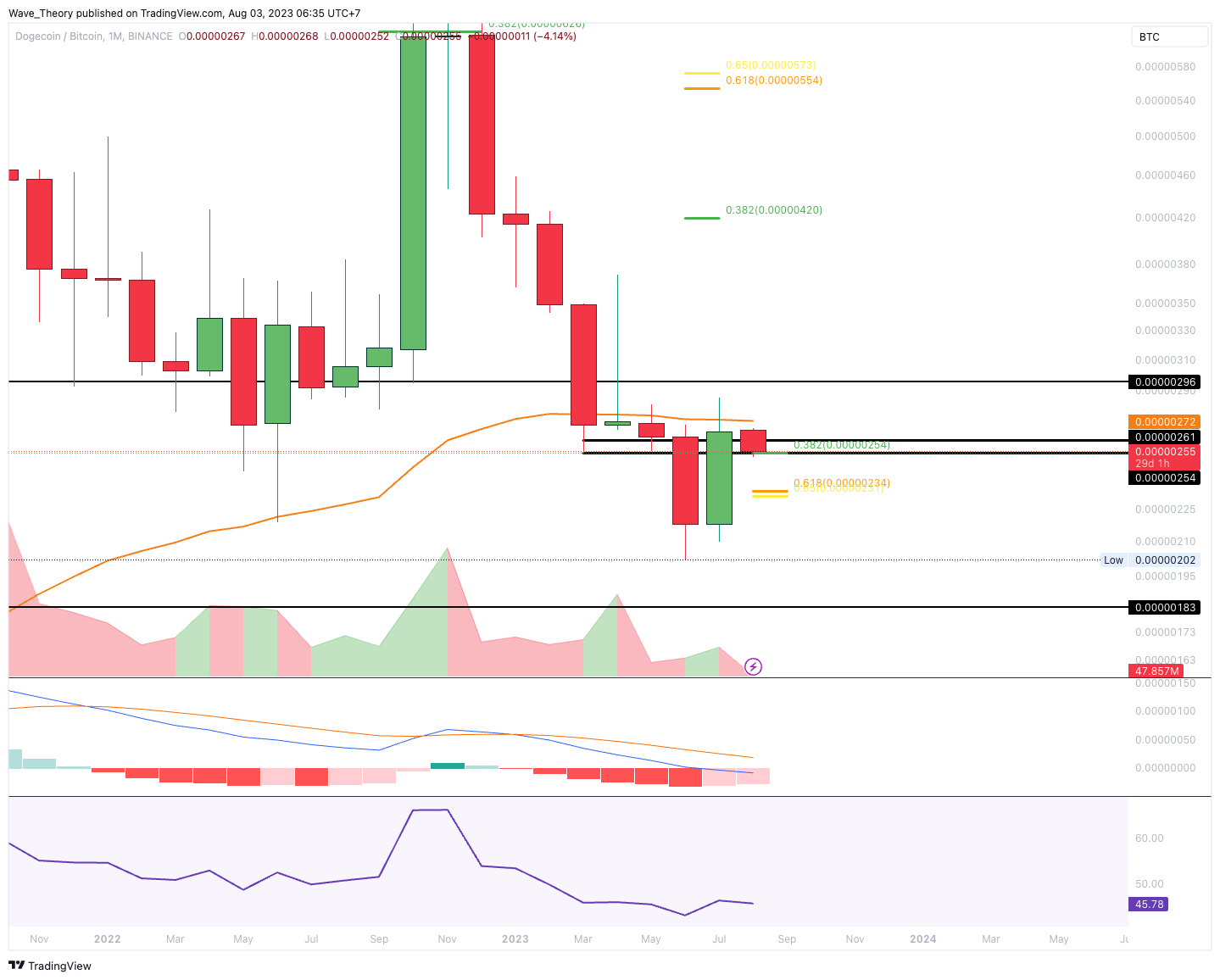 Gegen BTC konnte Dogecoin letzten Monat eine “Bullish-Engulfing-Candle” im Monatschart formen. Dennoch gelang es dem DOGE Kurs nicht, über dem 50-Monate-EMA bei rund 0,00000273 BTC zu schließen. Doch immerhin tickt das Histogramm des MACDs damit seit letztem Monat bullisch höher.