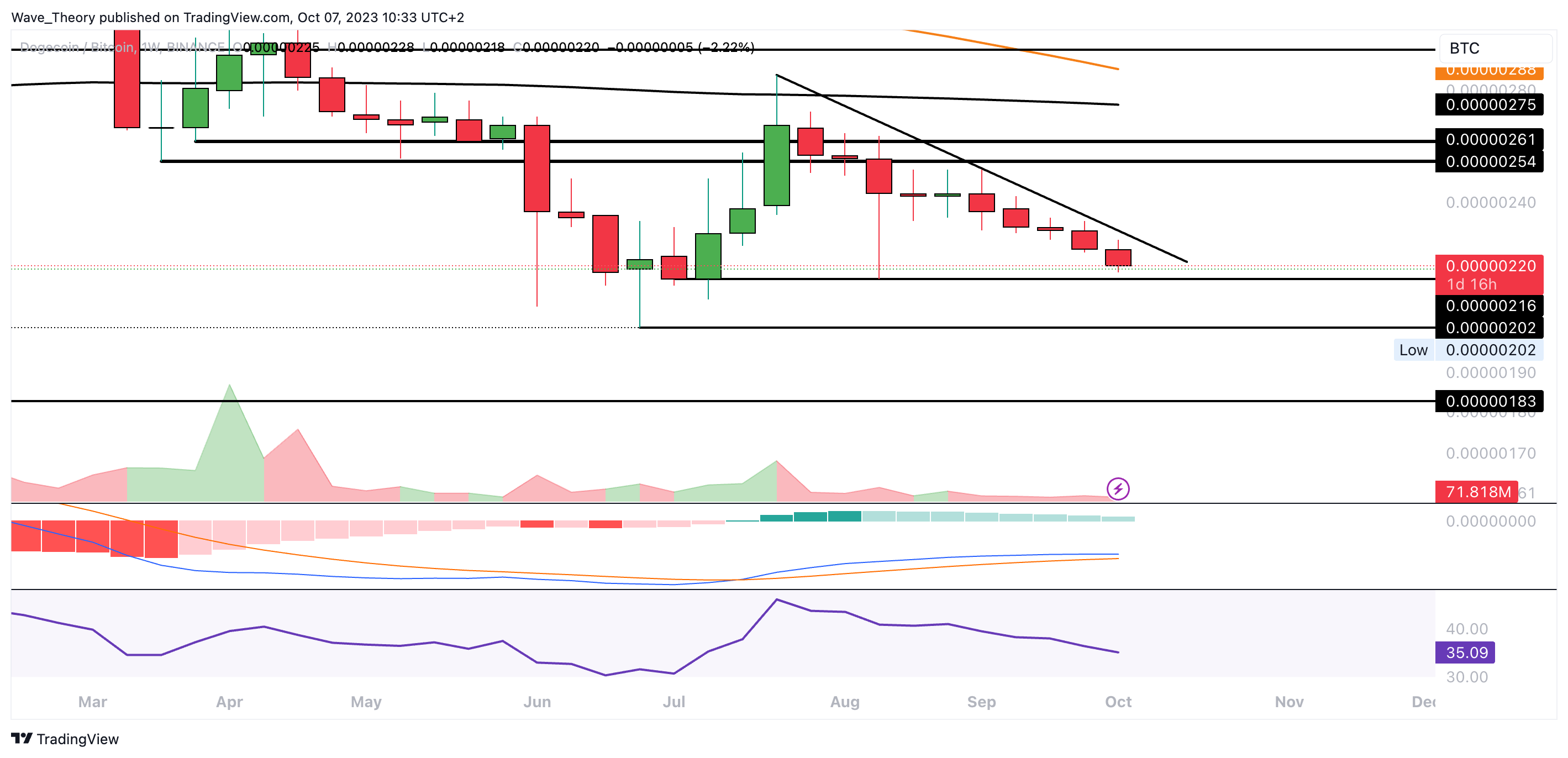Gegen BTC erreicht der Dogecoin Kurs bald signifikante Unterstützung