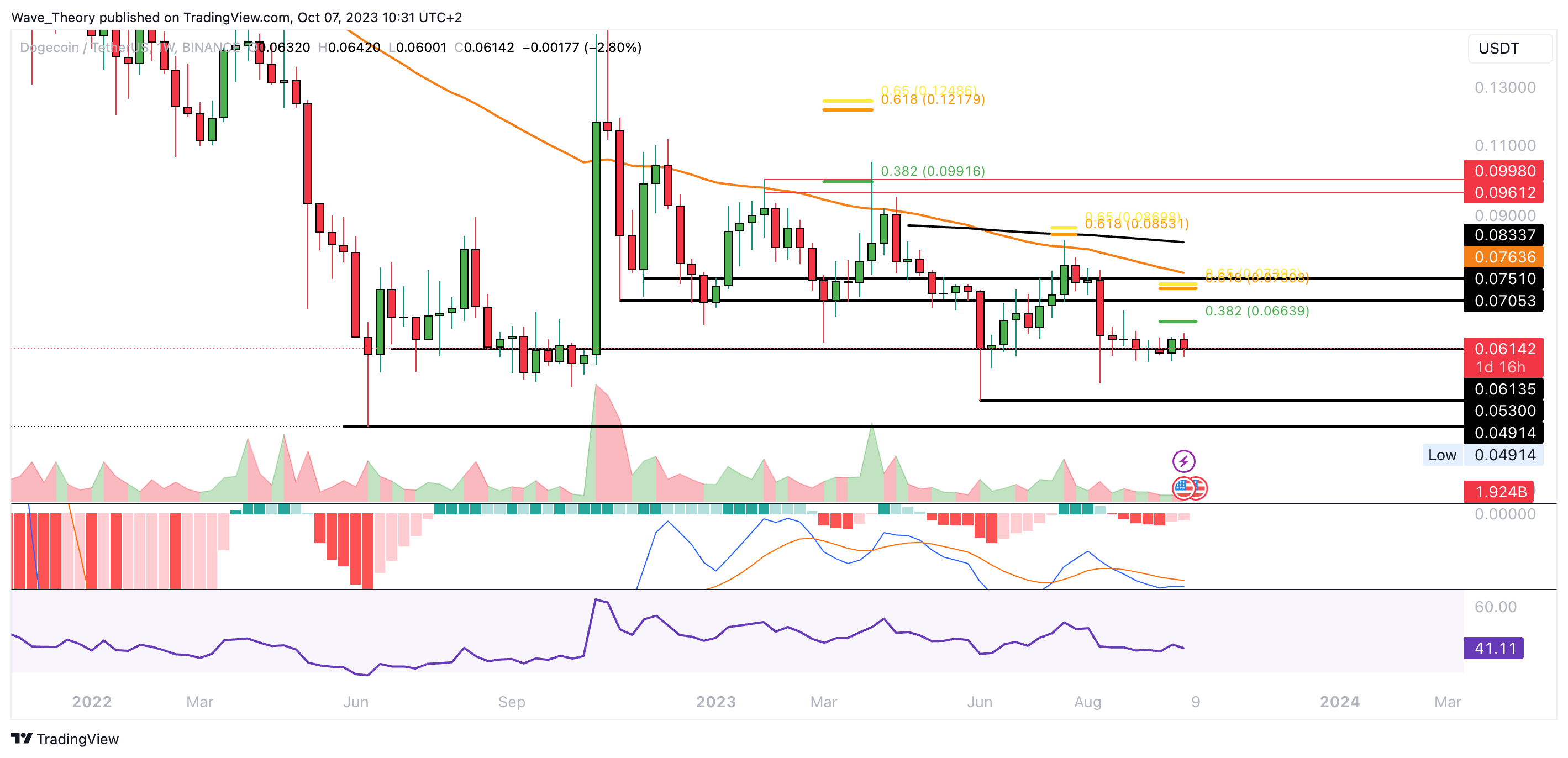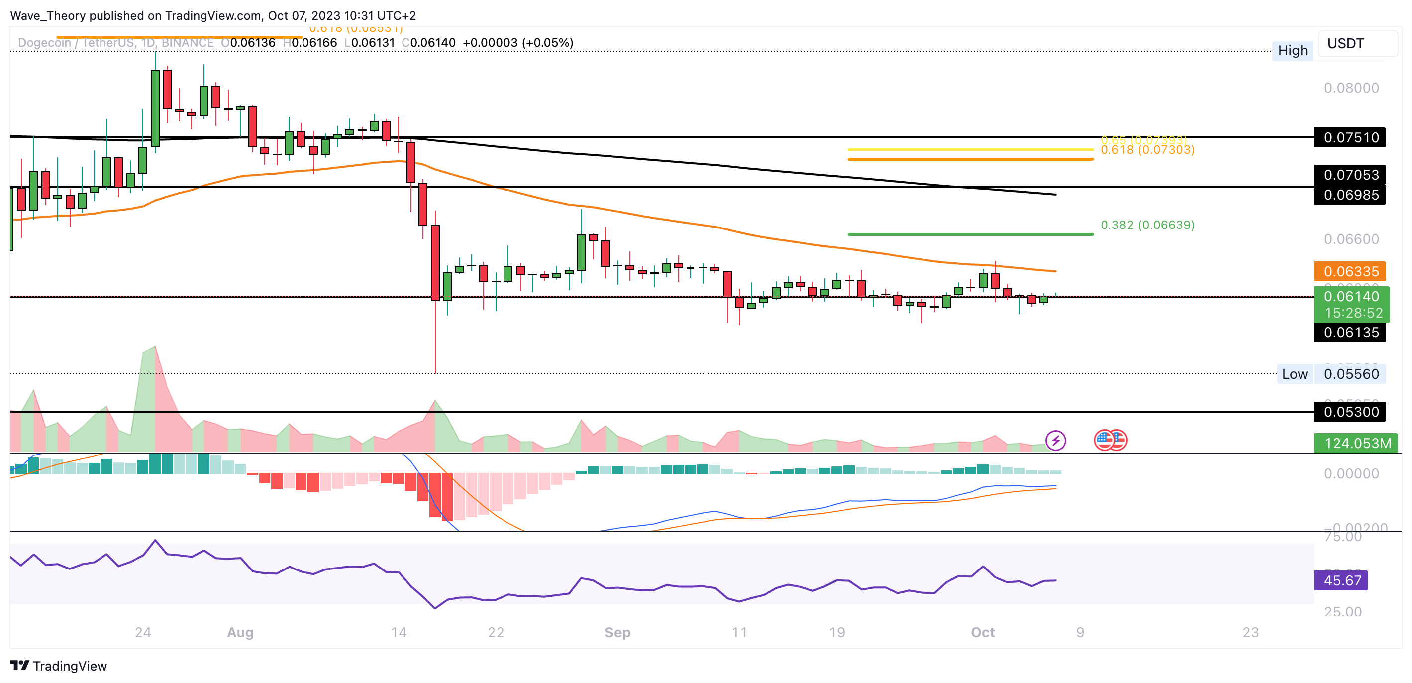 Vor wenigen Tagen wurde der DOGE Kurs erneut am 50-Tage-EMA Widerstand bei rund 0,06335 USD bärisch abgewiesen. Damit bleiben die Fib Widerstände bei rund 0,0664 USD und 0,074 USD außer Reichweite. Nach unten hin stößt Dogecoin bei rund 0,06135 USD und 0,053 USD auf signifikante Unterstützung.