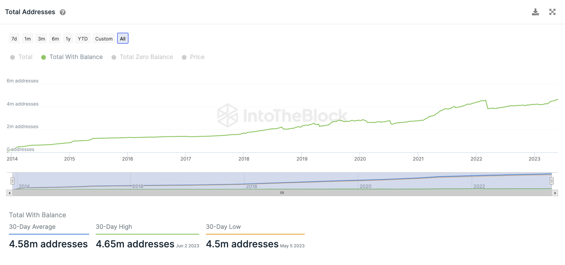 Im Gegensatz zu den Telegram Nutzern nimmt die Anzahl an DOGE Adressen weiterhin zu. Hier liegt also nach wie vor ein Aufwärtstrend vor. Insgesamt gab es in den letzten 30 Tagen rund 4,6 Millionen Adressen mit einem DOGE Guthaben.