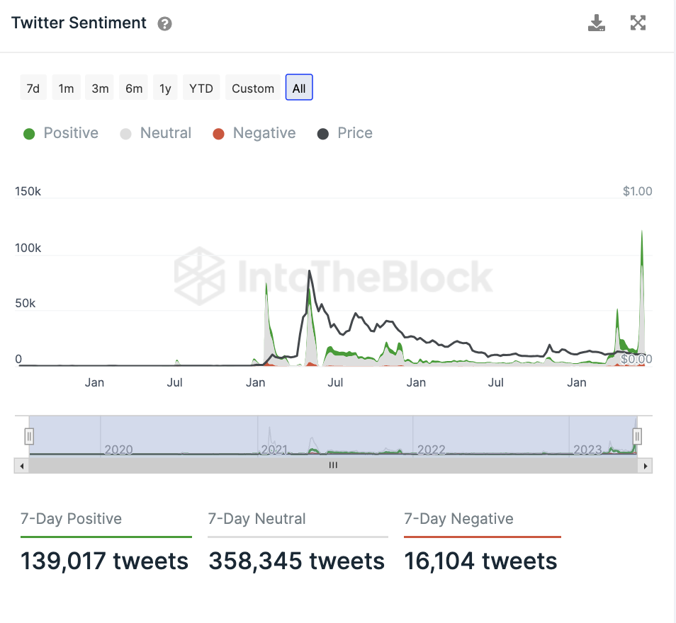 Auf Twitter lagen in den letzten sieben Tagen rund 139.000 positive Tweets zu Dogecoin vor und lediglich rund 16.000 negative. Demnach bleibt die Stimmung auf Twitter gegenüber Twitter überwältigend positiv.